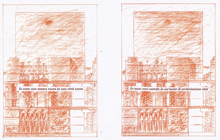 Tutta la mostra è quindi polarizzata su quanto, da uno schermo che proietta in sequenza l’e-book dell’autore, possa trasmigrare nello spazio e sulle pareti della galleria, facendo uso di alcune modalità concettuali in grado di dire molto con poco. In tal senso si riportano qui alcune parole dell’incipit del libro che un poco possono spiegare la complessità sia del ricordare, che del ricordare per riscrivere. “… non è una autobiografia, né una esposizione cronologica di progetti, neanche una descrizione circostanziata di cosa sia successo, nei vari luoghi, a proposito della strana professione di uno strano architetto…è una sequenza di ventisei brevi racconti, chiusi in sé e indipendenti l’uno dall’altro, per quanto appartenenti alla stessa vita, quella dell’autore. Ci sono a scorrere anche le parole, poche, via via come sussurrate dentro un dire e non dire che non è scrittura ma semplice soliloquio. Queste parole non spiegano le immagini (su cui hanno il privilegio di scorrere in piena libertà). Piuttosto cercano di dire quel poco e quel tanto, come in un tranquillo scambio di idee con il lettore, questo sconosciuto…”