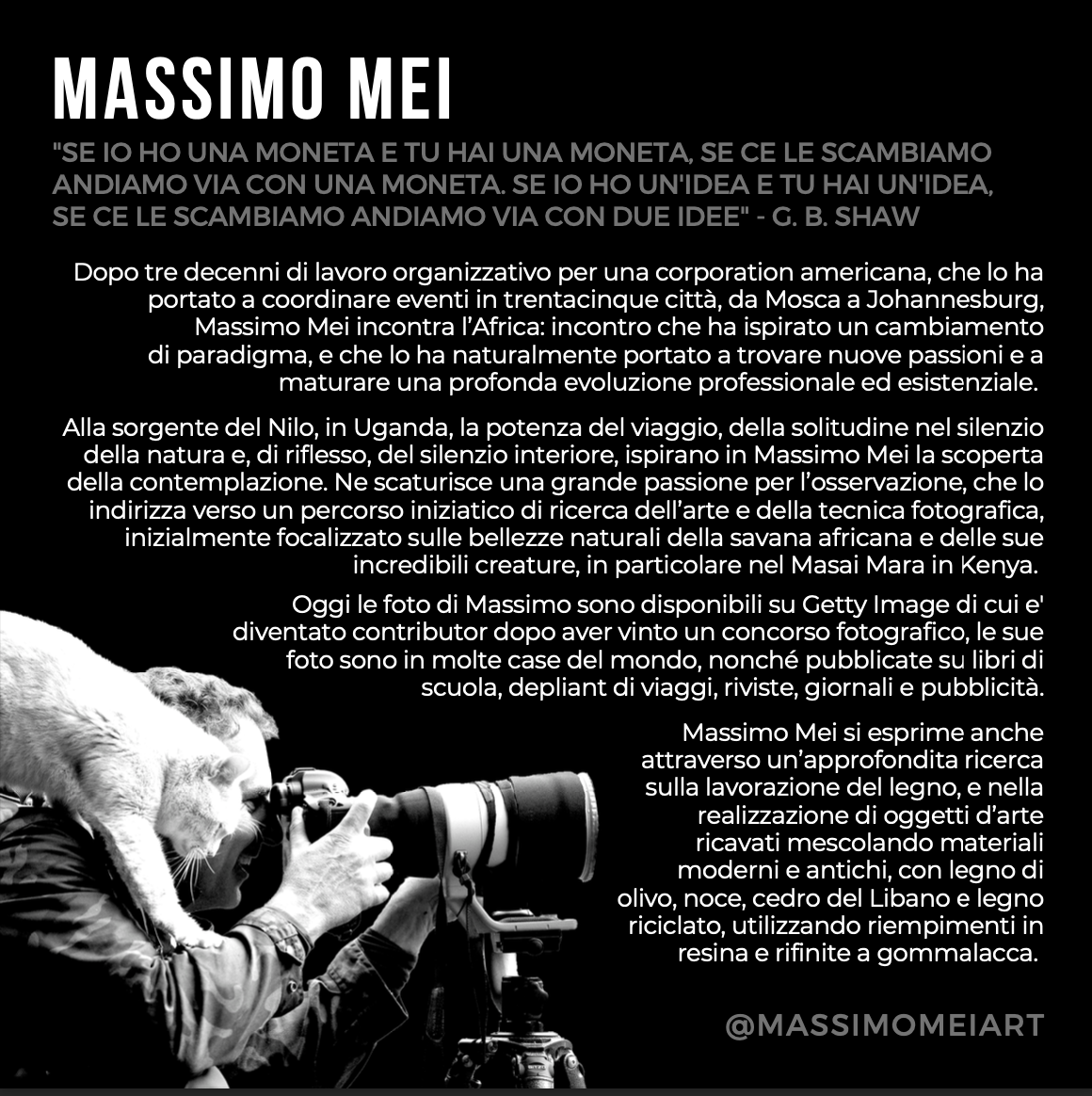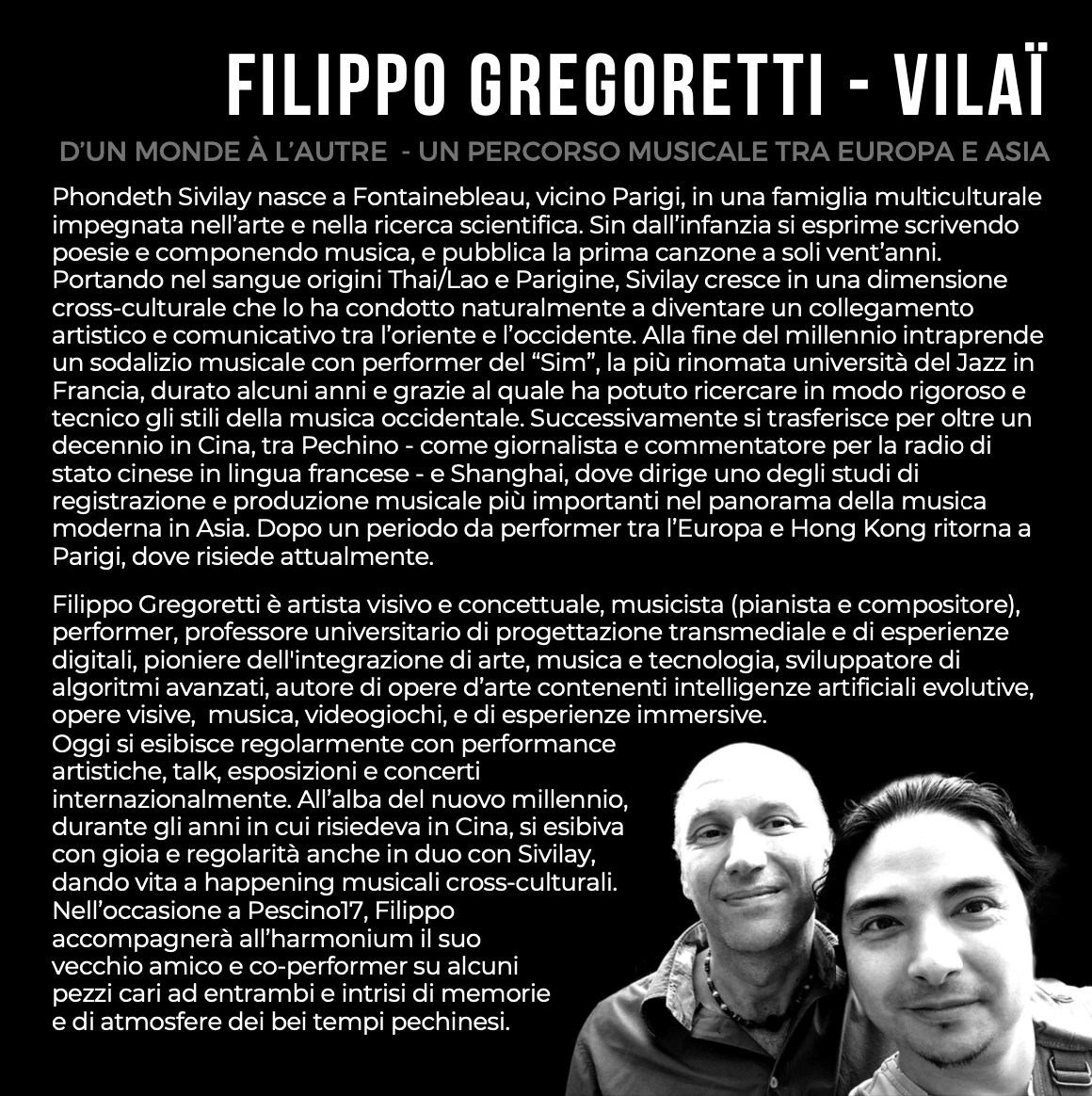 Massimo Mei si esprime attraverso un’approfondita ricerca sulla lavorazione del legno e nella realizzazione di oggetti d’arte mescolando materiali moderni e antichi. Filippo Gregoretti accompagnerà all’Harmonium, il co-performer Vilai.