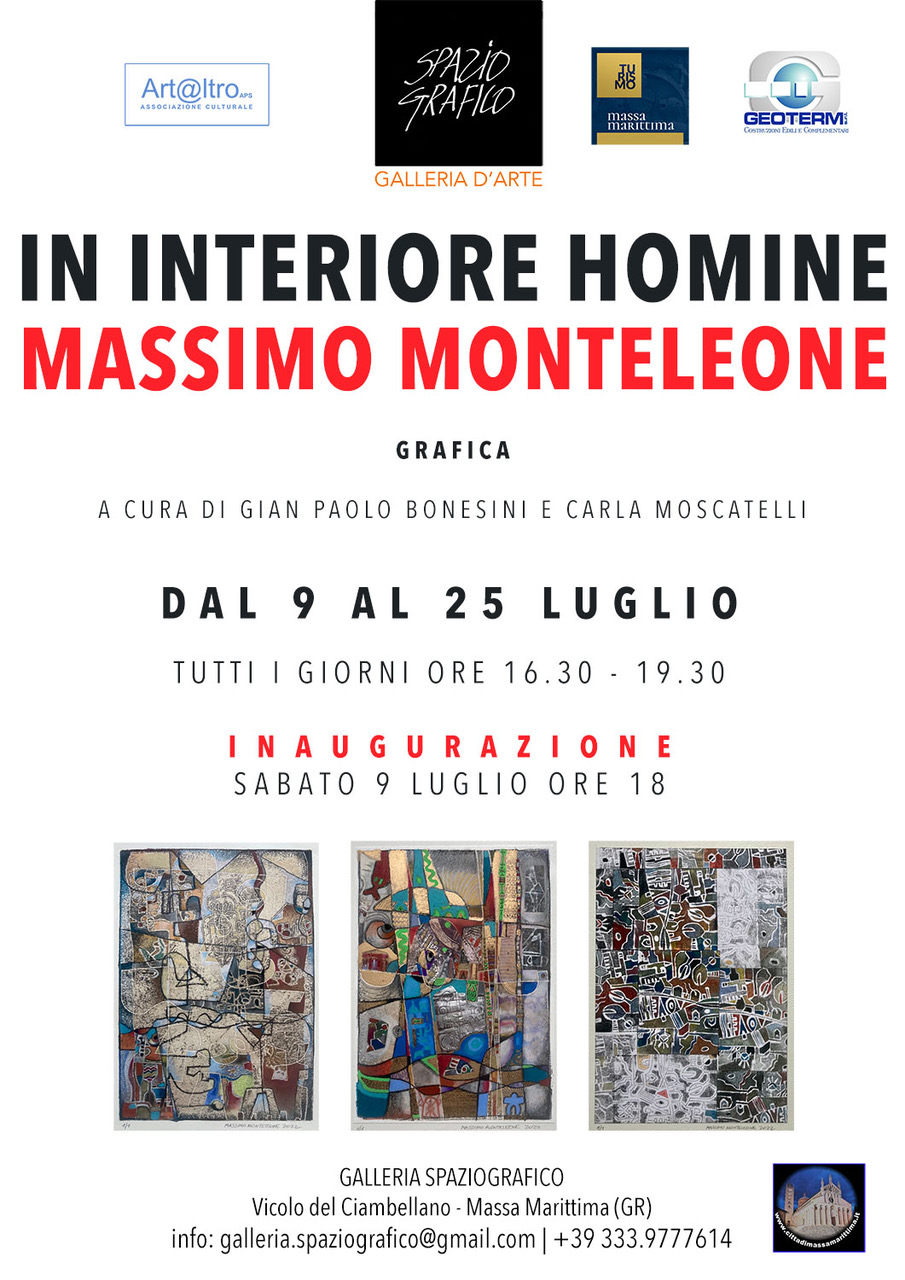 Le opere che la Galleria Spaziografico propone in mostra sono frutto di una riflessione dell’io cosciente di Massimo Monteleoni: un’artista colto e raffinato, la cui arte affonda le radici nel campo della grafica, in cui lavora da oltre trent’anni, e grazie alla quale è riuscito a perfezionale la tecnica delle sue opere che richiamano l’espressionismo astratto e l’informale. Una tecnica mista con l’aggiunta di colori ad olio, collage e materie che si fondono e si sublimano, dando vita ad un alfabeto segnico primitivo che racconta stati d’animo ed emozioni dell’artista.
