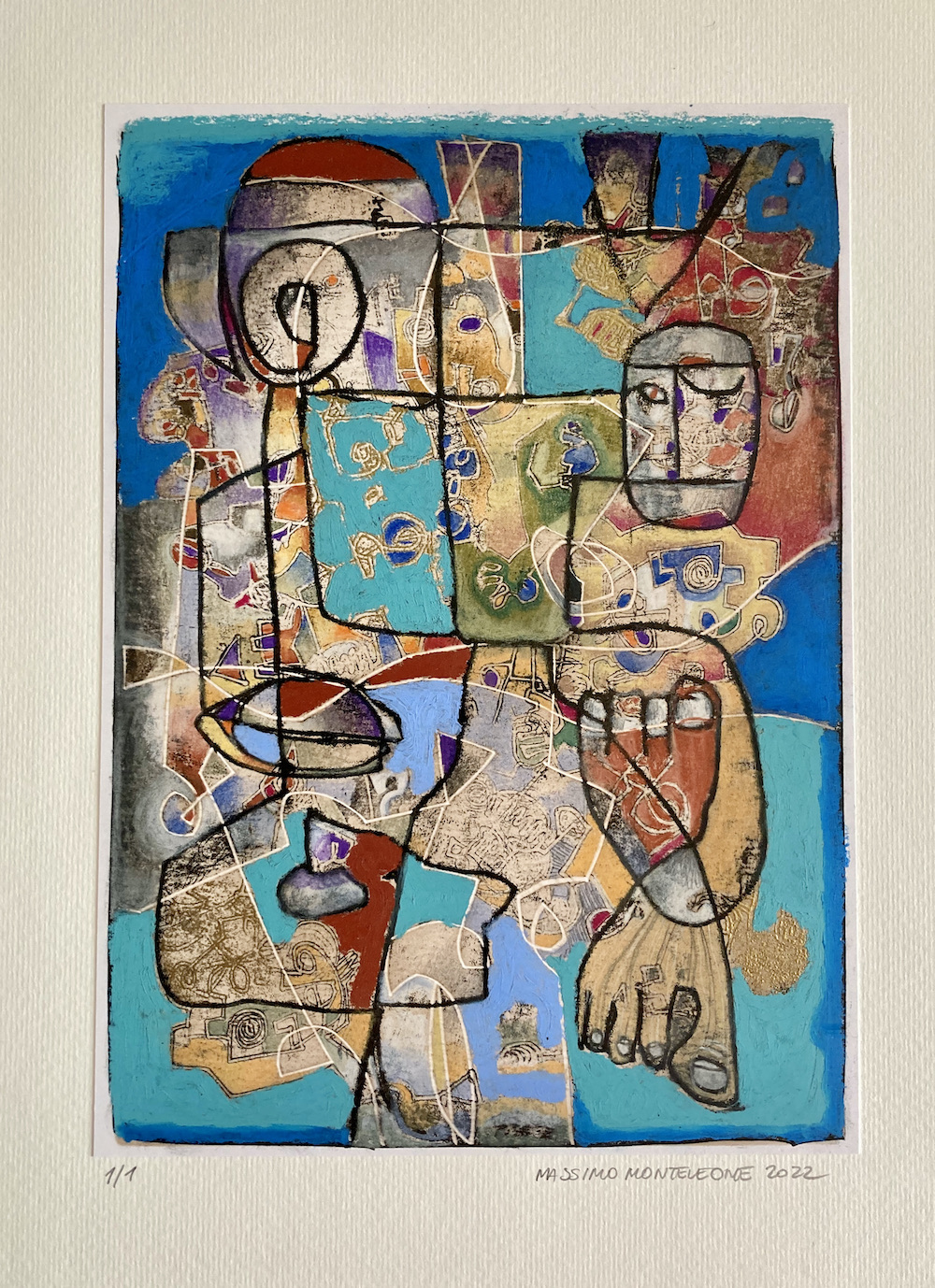 La maestria grafica di Monteleone, con la sua raffinatezza, dopo anni di monocromi si converte al colore: un’inedita e recente riflessione su se stesso che amplia la prospettiva emozionale e diffonde messaggi positivi