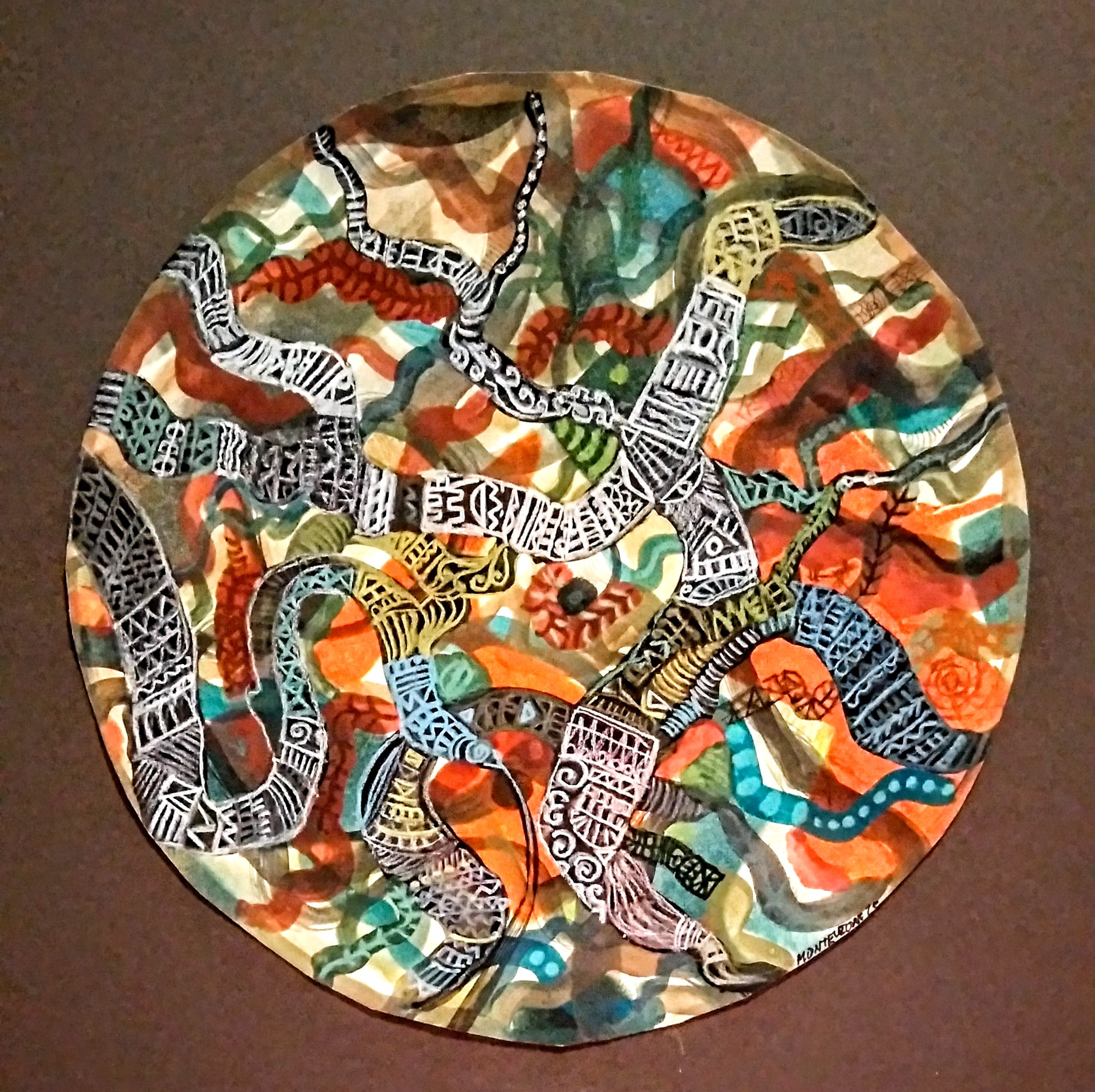 Il pretesto per riscoprire l’estro artistico, la pittura, il segno, il gesto. Un talento che ha attraversato molteplici espressioni, arrivate un giorno a concedersi una lunga pausa. Un ritorno al sentire dunque, al partecipare come artista nel mondo, ma con una consapevolezza nuova e ad un entusiasmo quasi infantile, quando delle stoffe, colorate degli inchiostri del suo lavoro di stampatore, lo ispirarono per la composizione dei primi collage, ai quali seguirono i primi contatti con la carta, utilizzando gli stessi inchiostri per la stampa, diluendoli, riportandoli come segni ricalcati, improvvisando sull’onda delle emozioni, elaborati universi di pura fantasia. L’atto creativo segue dunque un’urgenza interiore, un bisogno profondo e istintivo.