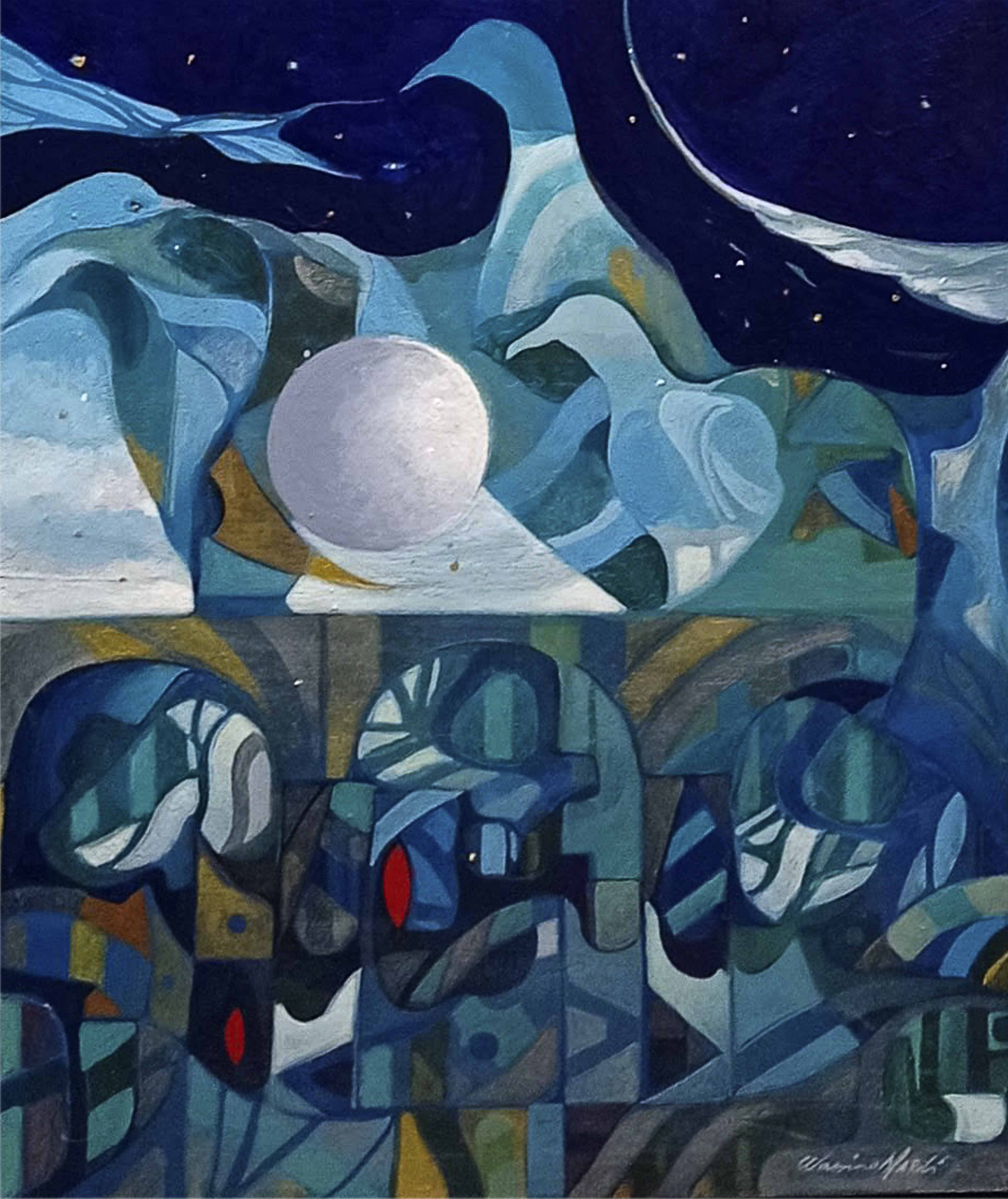 Nelle opere di Massimo Nardi aleggia un’atmosfera distesa, surreale che apparentemente invita a disertare la spasmodica complessità del presente per offrirci il conforto di un tempo sospeso, utile a riprendere fiato e, pertanto, essenziale priorità per la vita stessa.