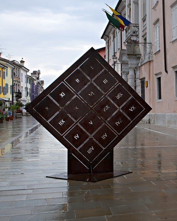 La grande scultura in ferro, intitolata XVI, realizzata da Massimo Poldelmengo nel 2012 e oggi posta davanti all’ingresso della Galleria, accompagna la mostra XVI e Impronta del XVI, un percorso in cui prende forma la storia di un progetto sviluppatosi in due opere diverse legate al medesimo pensiero. All’origine vi è la commissione a Poldelmengo di un’opera da porre nel vigneto di Ronco Pitotti, gestito da i Vignai da Duline: ispirato dalla bellezza del luogo, l’artista ha realizzato una “mensa” profana, che posta su uno sperone dominante l’anfiteatro del podere si offre al visitatore come luogo di sosta per la degustazione del vino sulla terra e nel paesaggio in cui è nato.