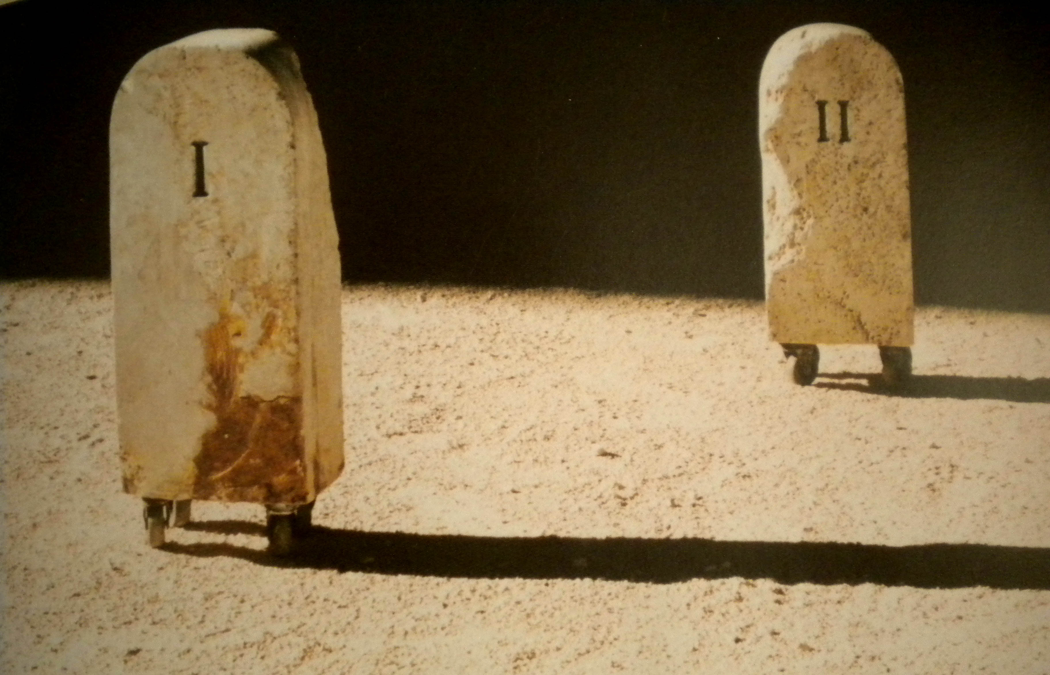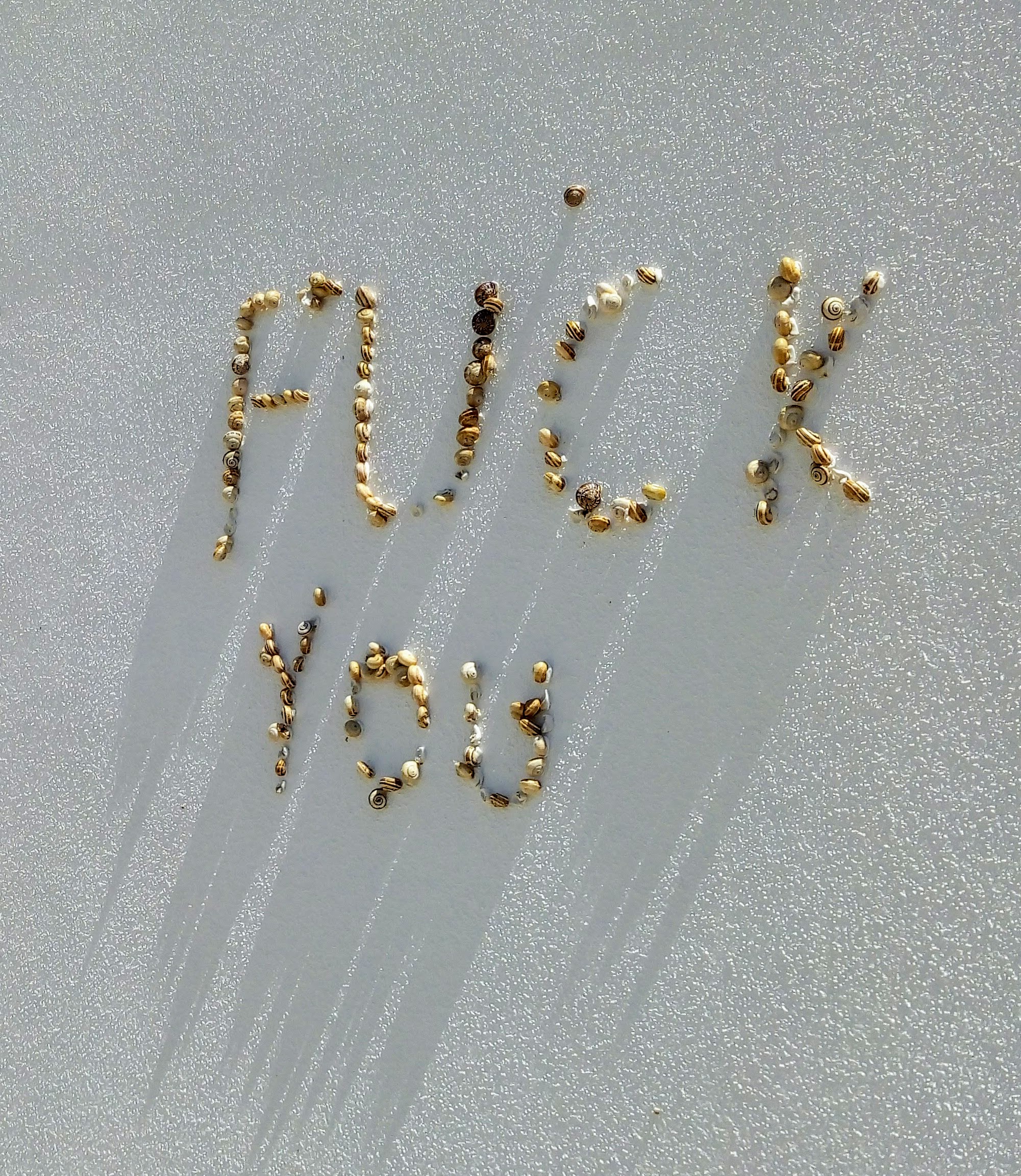 l’uso della figura retorica dell’ossimoro sia diventato strumento e collante trasversale nei lavori esposti nelle sale del museo. Nelle sue opere c’è sempre qualcosa che non c’è. Relativizza dogmi e certezze collaudate, vanificando esperienze umane che il tempo ha contribuito a solidificare. Così nel ciclo delle “Ombre assolute” del ’97, le immagini portatrici di realtà sono forate da nere cavità d’assetto geometrico, capaci di inghiottire lo sguardo. Buchi neri. L’immagine implode, tracolla e naufraga in se stessa, destabilizzando la percezione dell’interna figurazione. Accade anche nella sequenza pittorica dei pesci “Doppiomare” (2006) e “Nelle parole illuminate dei pesci” (2008) in cui il parlare è custodito dal mutismo dagli abitanti dei mari. Se nei “libri di cenere” la pagina non muore, si polverizza in idea, nelle “Pietre miliari mobili” sono destabilizzati i così detti punti fermi. Riesce con disinvoltura a relativizzare le leggi della conoscenza e fare della negazione un invisibile punto di forza. Ossimori che riescono a sovvertire le leggi che regolano lo spazio e il tempo. In “Qual è la direzione?” la meta desiderata è a portata di mano ma le bussole disorientano, non svolgono il loro collaudato lavoro. Relativizzano le posizioni offrendo non più lidi certi ma solo, forse, altri probabili approdi. Per arrivare a biovandalica “fuck you”, scritta composta di chiocciole vive, che in poche ore svanisce. Dissolvendosi evidenzia una temporalità dettata dalla natura che mette a dura prova la certezza tutta umana fondata sulla percezione del tempo e il suo scorrere è un procedere per negazioni dal forte valore affermativo. Vuoti che riempiono e pienezze forate d’infinito. L’affermare e il negare sono i presupposti per rendere concepibile l’opera nella sua vera identità. Strada che porta eventualmente alla completezza di un pensiero, il suo, che cerca nelle certezze umane, contraddittorie controfigure, possibili portatrici di nuove icone santificabili. E se la parte più viva dell’immagine fosse il suo cuore cavo? Se la sua parte più vera fosse la sua parte più nera che cerca di esprimere la sua vena poetica utilizzando immagini iconiche legate al non-essere? Nell’era dell’iper-immagine materializza l’anti-immagine. “Ombre assolute”, nella stagione del troppo medita sul meno, sui lati in ombra, invisibili solo ai ciechi.(G.Gigliotti)