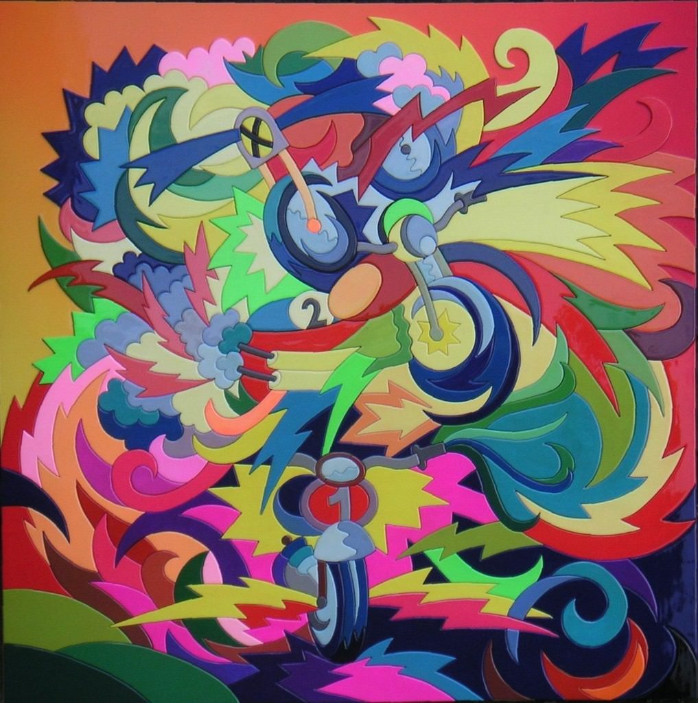 Tra le trenta opere inedite in mostra alla "Galleria del Palazzo" una particolare attenzione riveste il grande pannello a intarsi colorati intitolato "Speedway", che sarà presentato durante il vernissage dell’iniziativa e verrà utilizzato per la presentazione dei nuovi scooter Malaguti griffati Enrico Coveri.