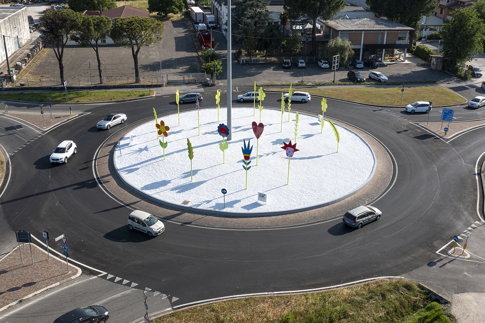 La rotonda, progettata dall’artista su commissione di Dino Zoli Group, vincitore del bando indetto dal Comune di Forlì nel 2015, sottolinea la vocazione “contemporanea” della città, attraverso un’installazione gioiosa e colorata che si ispira alle meraviglie della natura per parlare di ecologia, sostenibilità e rinascita.