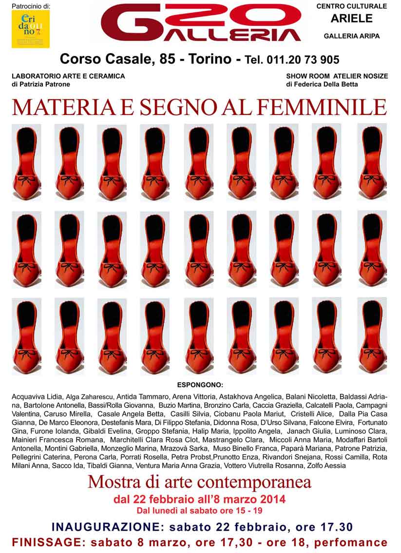 Materia e segno si possono anche leggere attraverso un’altra dimensione suggerita dalla stessa strutturazione dell’evento: così il finissage, tra le stoffe della performance e il colorismo fiammante e luminoso delle scarpette rosse, scrive sulla materia un segno di leggerezza e insieme di implacabile richiesta di considerazione e di rispetto.