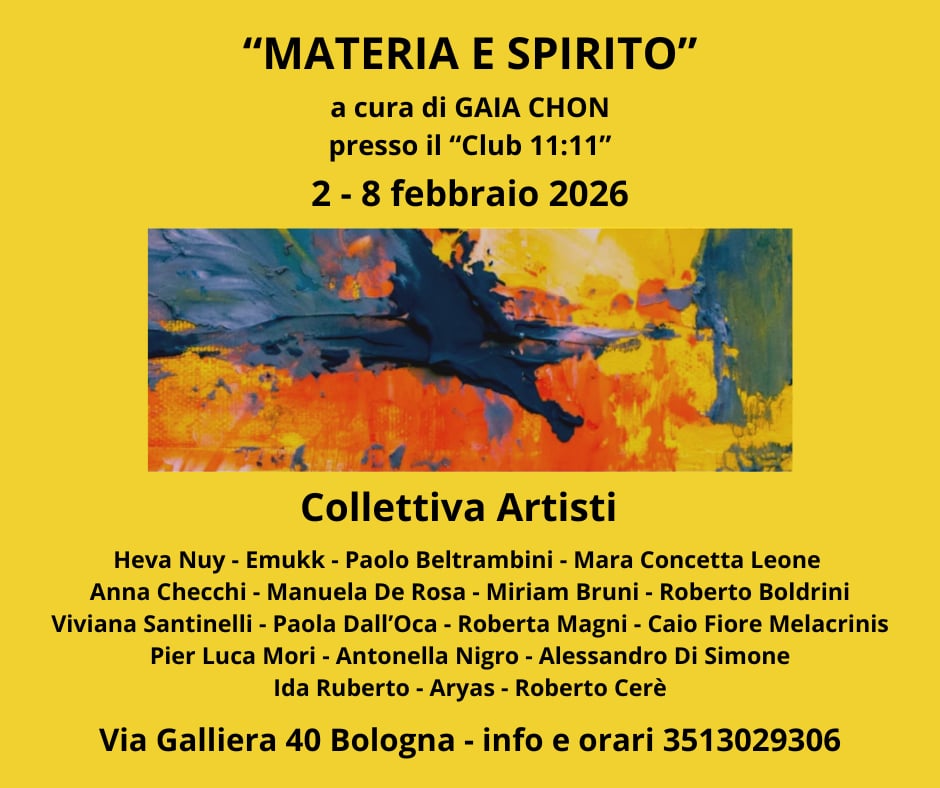 Materia e Spirito, collettiva artisti di arte contemporanea dal 2 all’ 8 febbraio 2026 a Bologna, a cura di Gaia Chon e una ventina di artisti di stili ed esperienze molto differenti fra loro che si sono interrogati su questo tema.