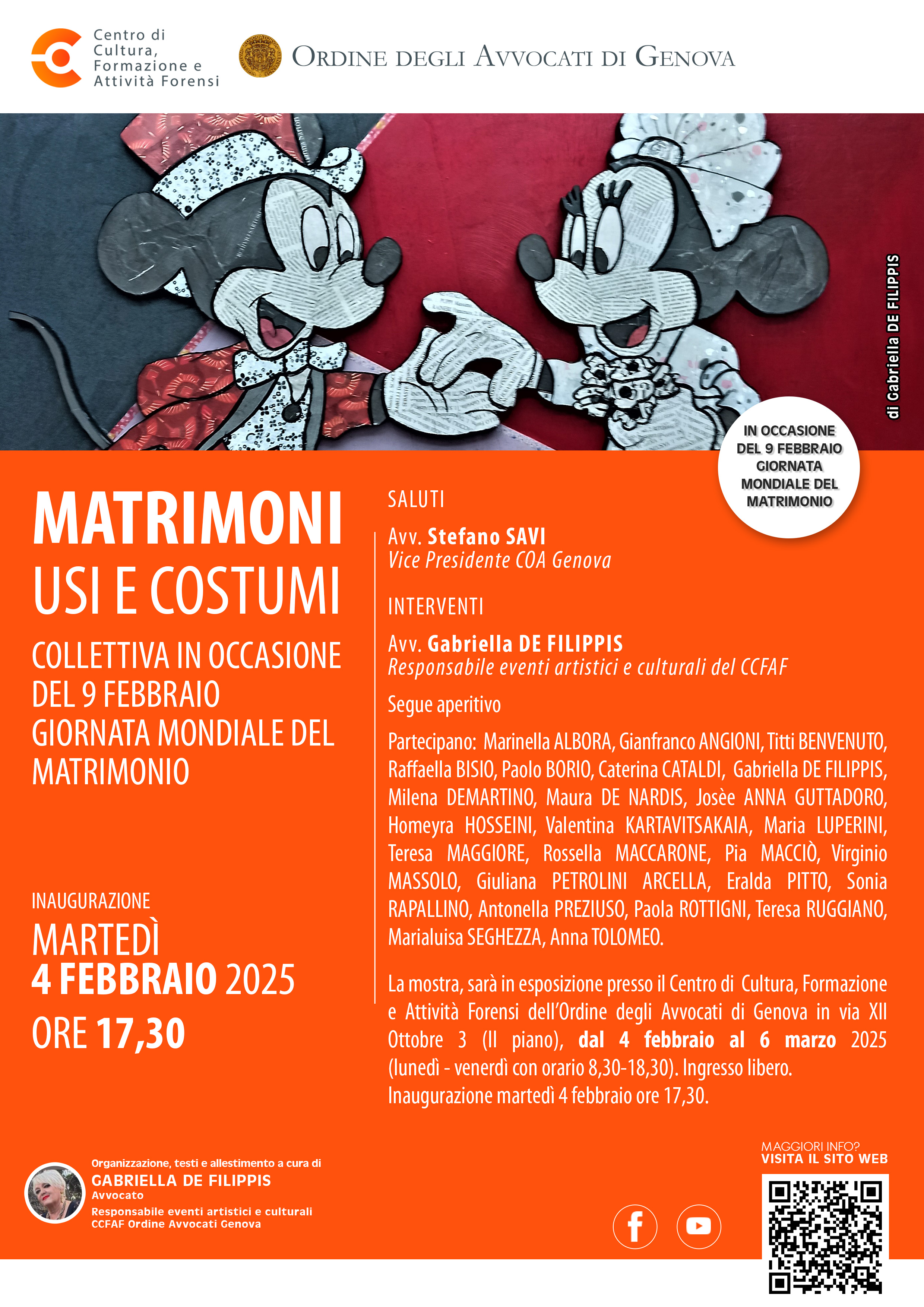 In occasione del 9 febbraio, Giornata internazionale del Matrimonio, martedì 4 febbraio 2025, alle ore 17,30, nei locali del Centro Cultura Formazione e Attività Forensi, in via XII ottobre 3, sarà inaugurata la mostra dal titolo MATRIMONI - USI E COSTUMI, collettiva di arti varie alla quale hanno partecipato una trentina di artisti prevalentemente liguri.