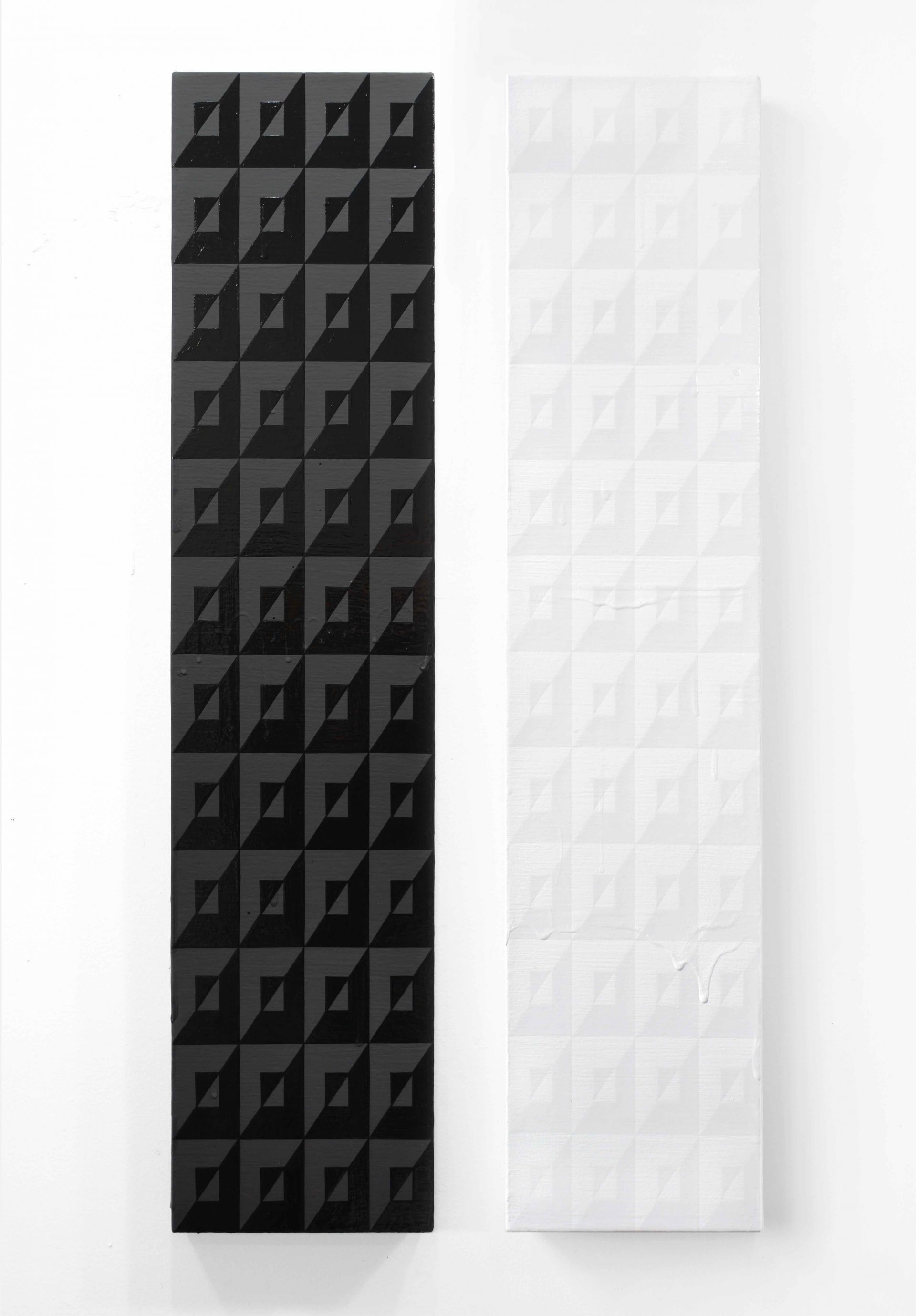 Nella serie di lavori monocromatici in mostra Mignanelli riesamina le continue interazioni tra la luce e la superficie attraverso l’uso alternato di piani riflettenti ed opachi alla persistente ricerca di purezza e semplicità.