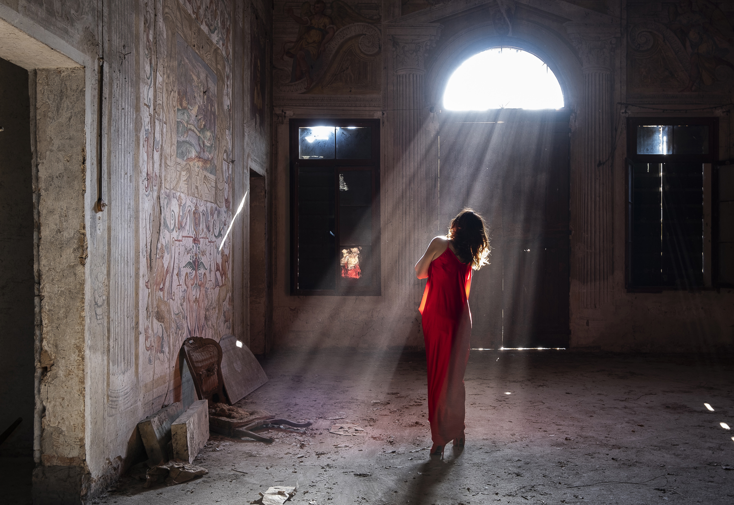 Luoghi vuoti carichi di segni e tracce di precedenti esperienze di vita. Le opere in mostra sovrappongono a questi fondali segnati dalla mancanza, dall’assenza, le forme, teatralmente spettacolari, di un ulteriore scenario dominato da seduttive figure di donna.
