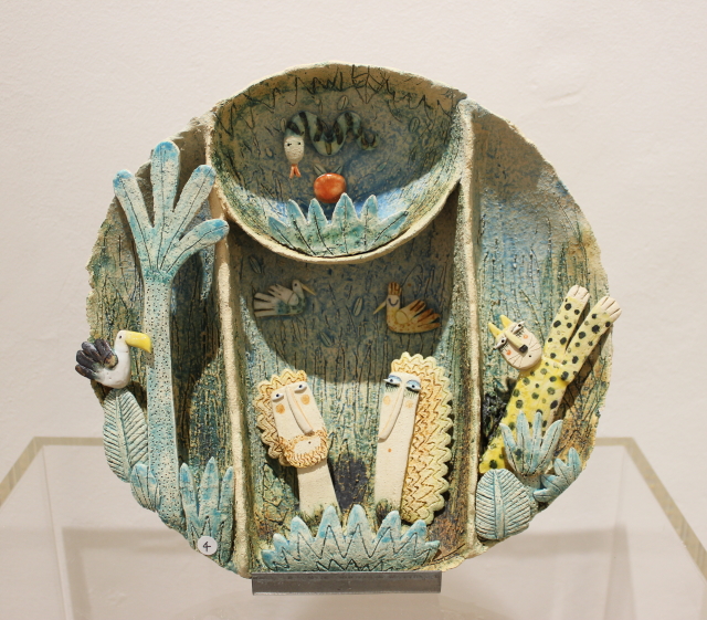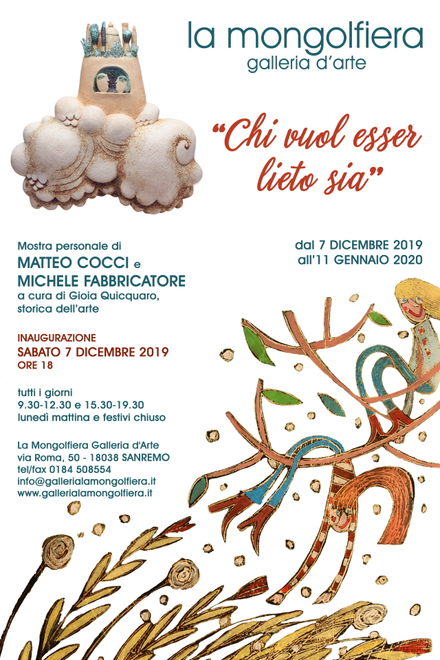 Michele Fabbricatore è un affermato ceramista fiorentino: due anni fa aveva esposto qui da noi con la mostra "Fabbricatore racconta Italo Calvino" e quest'anno ritorna con le sue ceramiche ispirate ai temi della natura e della letteratura. Come lui stesso afferma «Nelle mie opere faccio confluire in un grande calderone tutto ciò che mi piace e mi appassiona: da Calvino all'Orlando Furioso, dalle fiabe alla mitologia, il tutto rivisitato e reinterpretato con un occhio ironico e surreale. La mia missione è quella di recuperare la parte di me più autentica e vergine, quella del bambino privo di condizionamenti e schemi, che guarda il mondo con stupore e meraviglia.