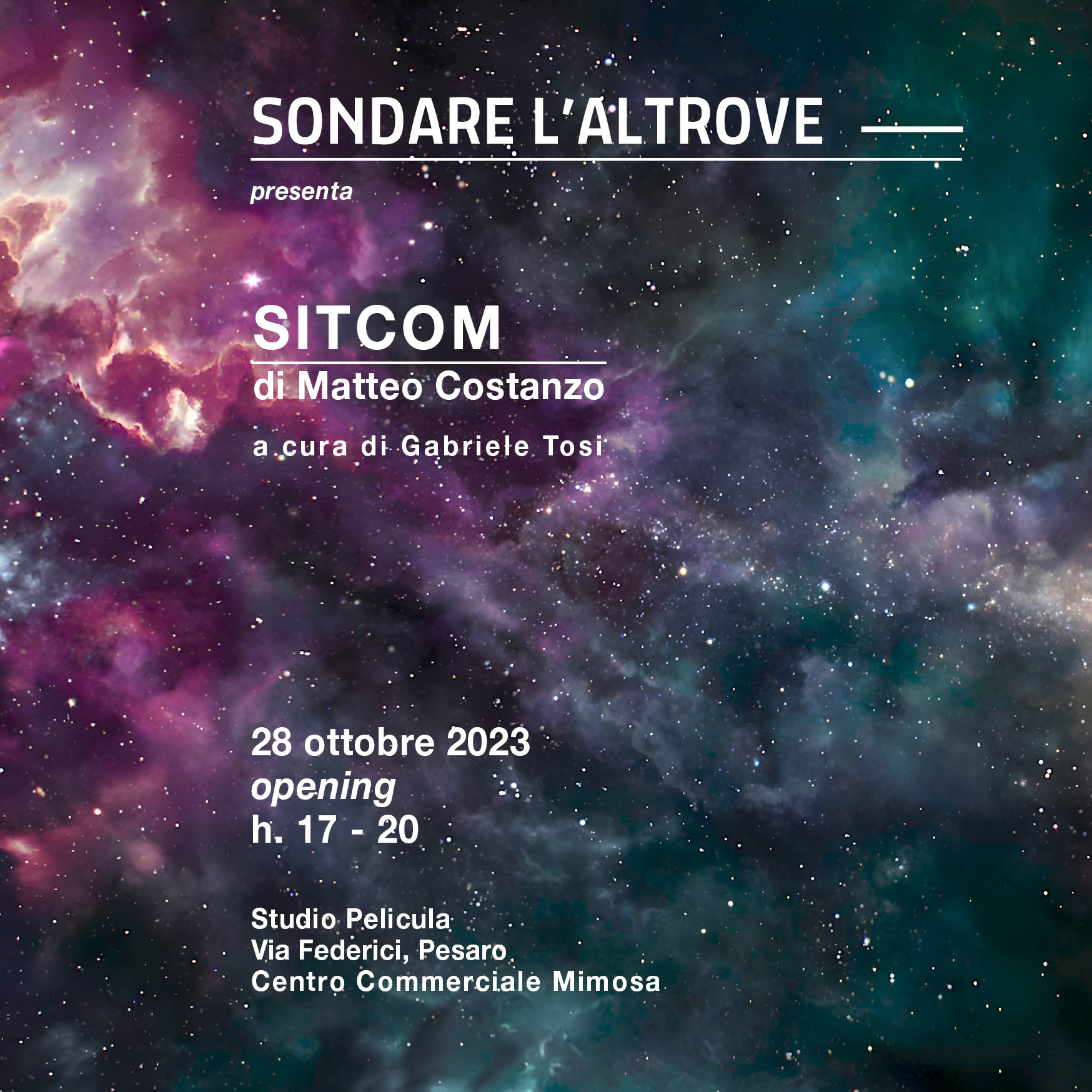 Pesaro, Il 28 ottobre, alle ore 17, "Sondare l'Altrove" riapre le sue porte con "Sitcom" di Matteo Costanzo, a cura di Gabriele Tosi. L'evento, della durata di una giornata, si svolgerà all'interno dello studio fotografico di Michele Alberto Sereni, continuando una programmazione iniziata nel 2018. Il progetto è organizzato da Pelicula Studio Fotografico.