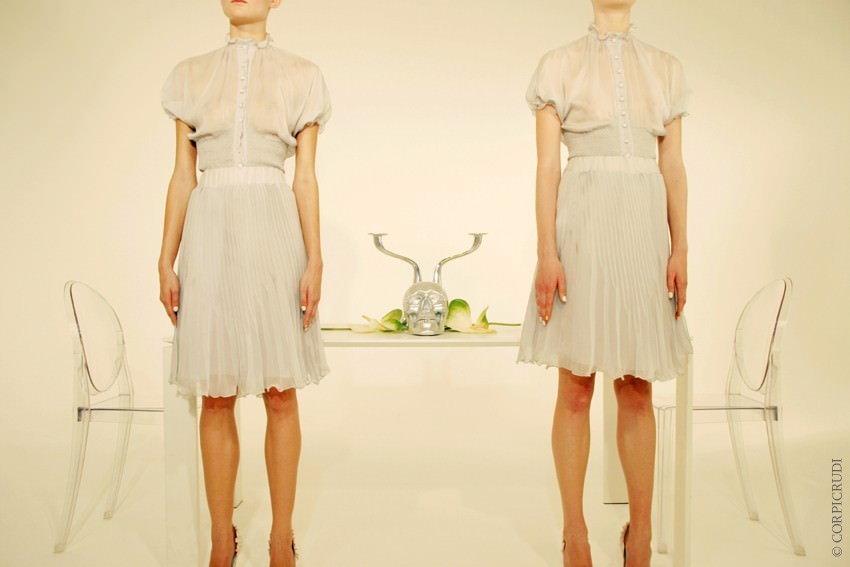 CORPICRUDI sono Samantha Stella e Sergio Frazzingaro (Genova, Italia), attivi dal termine del 2003 con progetti ibridi tra arte contemporanea, musica e stile. Nella convinzione che l’arte debba dispensare armonia e che l’estetica ne sia fondamentale elemento, la ricerca sviluppata da corpicrudi si incentra sulla tematica wildiana della finzione, e la necessita’ di trovare in essa l’unico approccio possibile alla rappresentazione dell’idea di bellezza.
