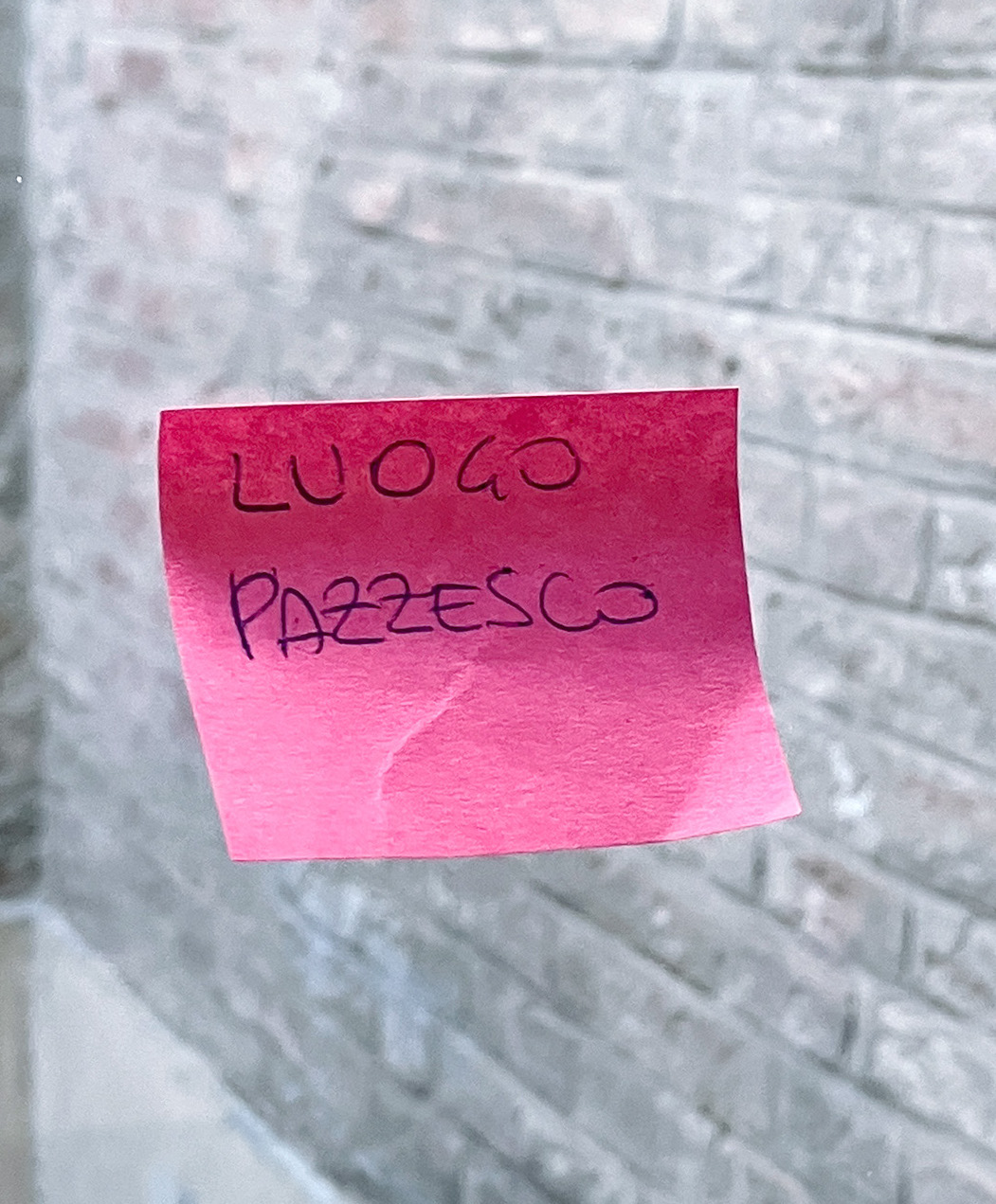 Luogo Pazzesco ospita dal 21 marzo 2023 l’installazione site specific Autoritratto (2022) di Matteo Messori. L’artista lavorando su un’ibridazione del linguaggio pittorico e scultoreo realizza installazioni ambientali in cui la relazione tra uomo-natura-arte viene indagata e rappresentata nelle sue fasi di concretizzazione. Autoritratto si iscrive in questa pratica in quanto la pittura e la materia si incontrano nel definire la frammentarietà e contemporaneamente l’unità dell’identità umana. Una serie di mattonelle e piastrelle sono distribuite nello spazio e a tenerle insieme è una pittura blu che crea un nuovo legame tra forme e materiali arrivando ad un’immagine organica e unitaria.