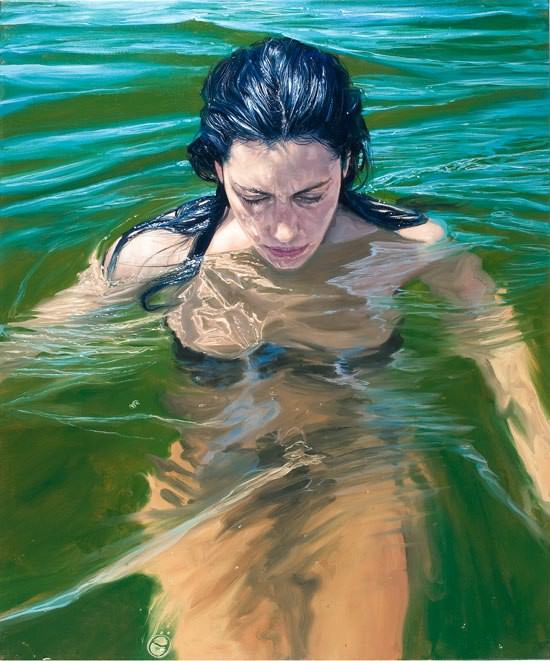 La mostra vede protagonista un’unica figura femminile immersa nel suo più antico contraltare simbolico: l’acqua. Ventitrè tele tutte di uguali dimensioni che riproducono un unico movimento creando percorsi di pittura assolutamente inediti per l’artista. Una mostra dall’impatto immediato che mette in scena la circolarità di un evento che si ripete potenzialmente all’infinito. Ogni opera riproduce un frammento di istante del movimento di una donna che si immerge nell’acqua e riemerge. La figura della donna nell’acqua si disfa, si dilata, si confonde con l’acqua, perde i suoi connotati identitari, ad un certo punto diventa essa stessa acqua per poi lentamente ridisegnarsi, ricompattarsi, riemergendo rinnovata, uguale a se stessa eppure non più la stessa.