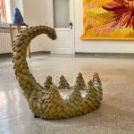 Burning Treasure traccia i contorni di una nuova cosmologia in cui diversi piani temporali coesistono e si sovrappongono, suggerendo l’idea di un movimento ciclico, di una rinascita già implicitamente contenuta nella fine del mondo. Due grandi arazzi, una scultura in ceramica e una fontana zoomorfa sono gli elementi a cui l’artista affida una storia del nostro Pianeta, soggetto a una pulsione distruttiva, ma capace di favorire la sviluppo di nuove forme di vita attraverso la graduale sostituzione delle precedenti.