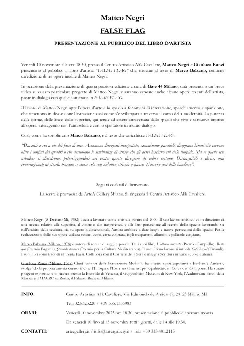 In occasione della presentazione di questa preziosa edizione a cura di Gate 44, sarà presentato un breve video sul lavoro di Matteo Negri e saranno esposte anche alcune opere recenti dell’artista, poste in dialogo con quelle contenute in False Flag.