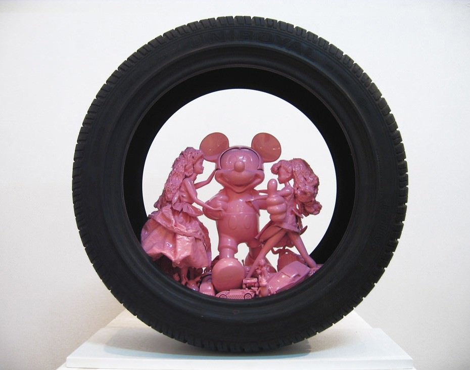 Con una “mise en scene” quasi teatrale, l’artista scolpisce secondo uno schema narrativo che dal titolo dell’opera, alla sua realizzazione, pone grande enfasi nei dettagli, ai quali spesso è delegato il compito di mostrare una visione del mondo velata di sarcasmo, che per spiegarsi usa vecchi segni a tutti noi riconoscibili, come il Mikey Mouse utilizzato nell’opera “Io vado in bicicletta”, fiero, spedito, a braccetto di due Barbies ci saluta con il pollice alzato da dentro uno pneumatico di grandi dimensioni su cui l’artista miniaturizzato pedala in salita.