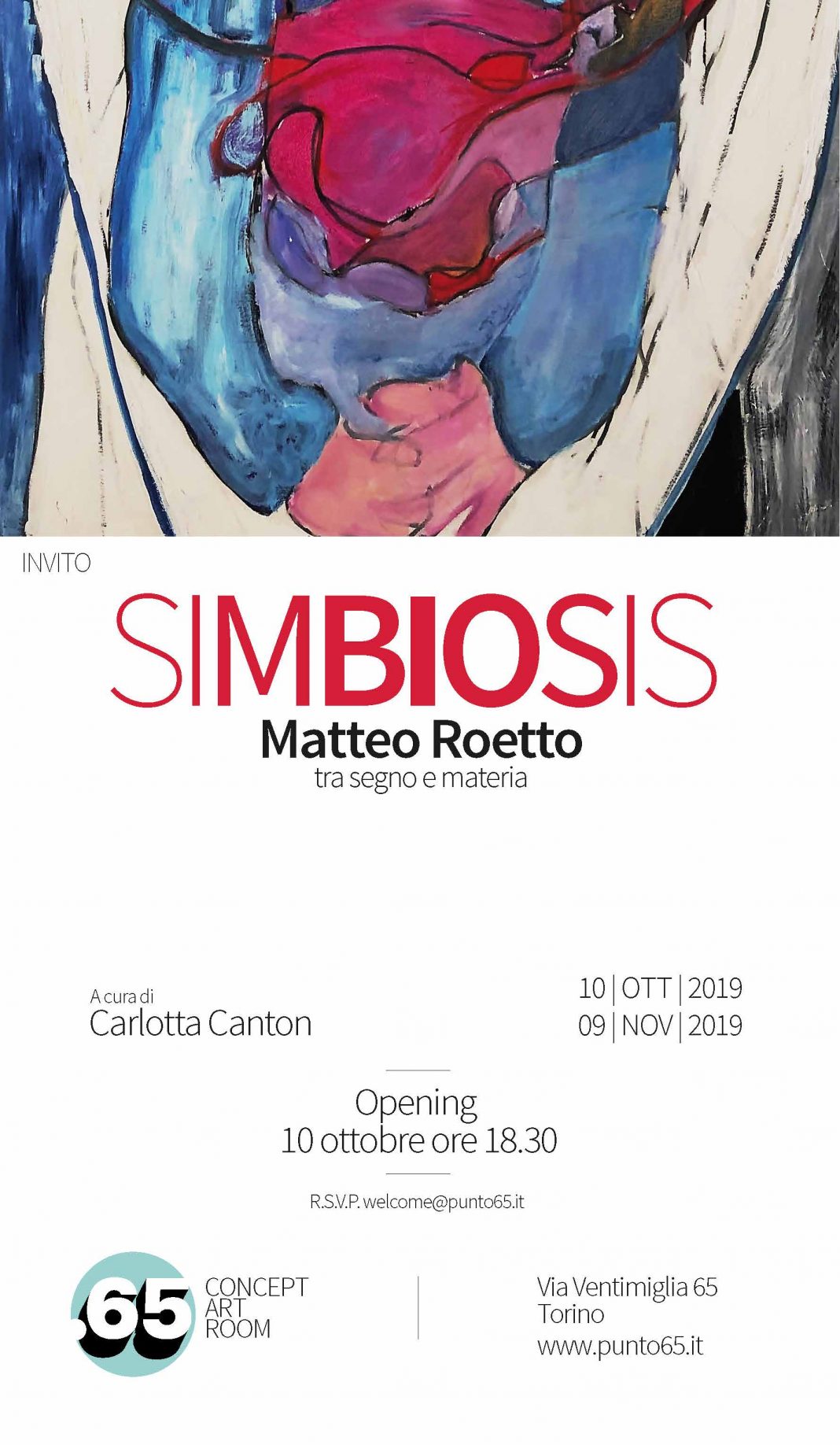 Punto 65 Concept Art Room apre la nuova stagione ospitando la mostra di un giovane artista, Matteo, Roetto che con Simbiosis, a cura di Carlotta Canton, esordisce nella sua prima personale. La mostra ospiterà circa 25 tele a tecnica mista.