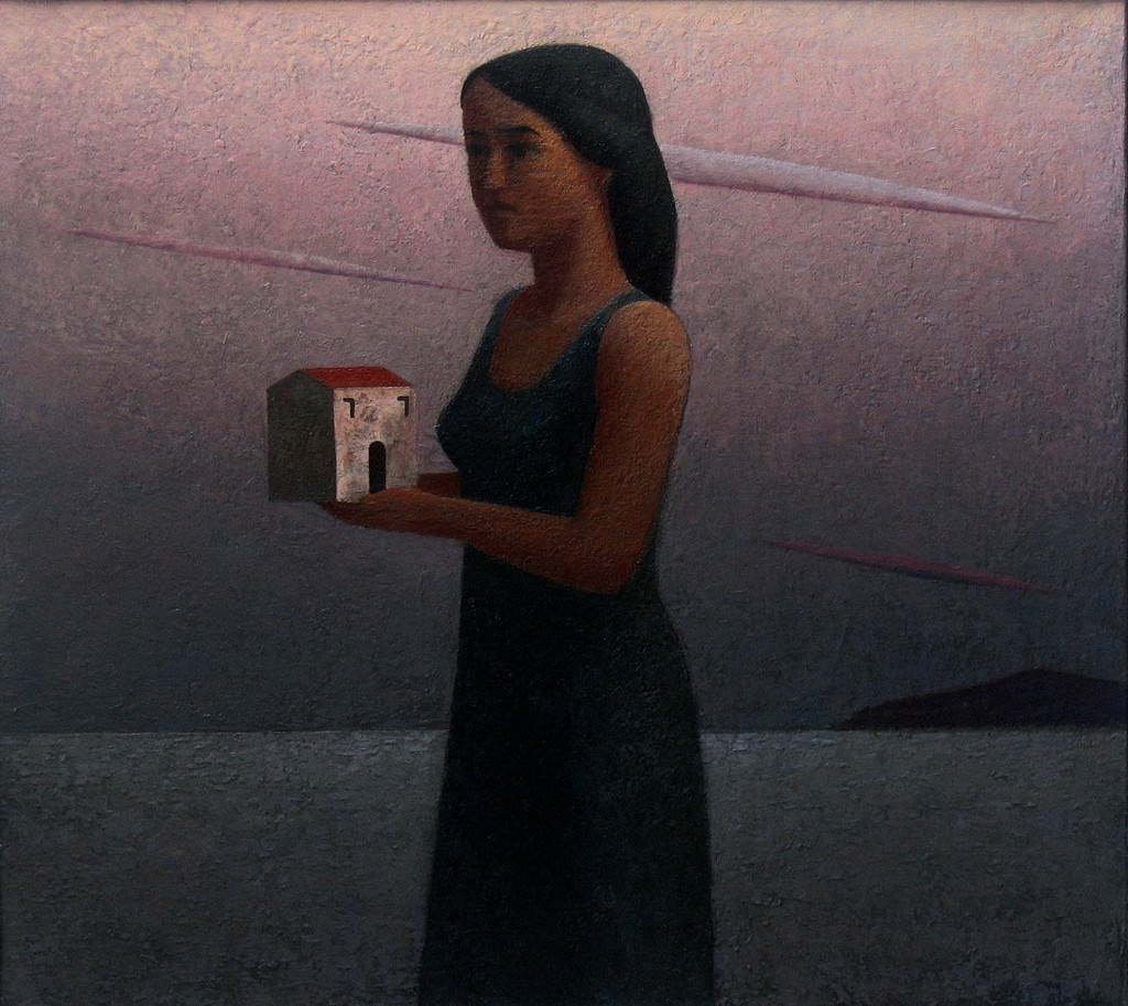Con minime variazioni, su cieli che di volta in volta virano all’azzurro, al rosa di un’alba o all’arancio che precede il tramonto, le case tornano tela dopo tela, al tempo stesso rassicuranti e ossessive come un sogno ricorrente. Mantenendo intatta l’essenzialità di una tavolozza giocata sugli ocra, sui grigi, sui verdi cupi e alzata dal rosso dei tetti