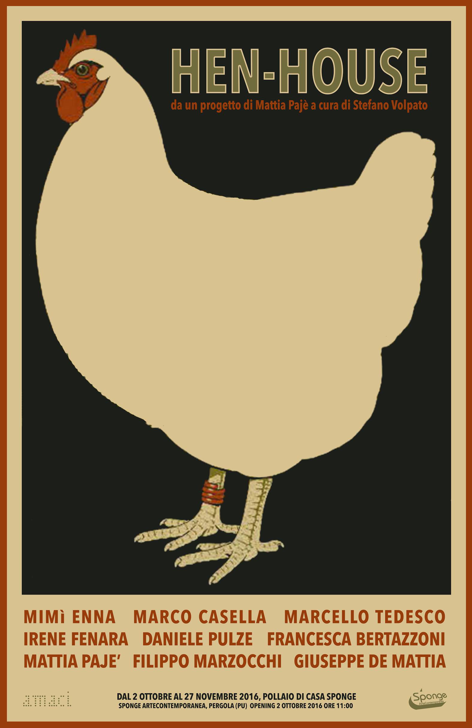 Mattia Pajè, giovane artista milanese di nascita, bolognese d’adozione, realizza un intervento che si inserisce con tatto e delicatezza nell’atmosfera domestica di Casa Sponge: il suo video è riprodotto nella piccola tivù del salotto, che il visitatore o l’ospite di passaggio può comodamente guardare seduto sul divano o in poltrona. Interessato all’esplorazione e all’interazione con gli spazi e i luoghi, alla loro messa alla prova, Pajè ha concentrato la sua attenzione su di un luogo marginale e, ai più, nascosto di Casa Sponge, ma assolutamente integrato e vitale nel suo ecosistema: il pollaio, la cui architettura è frutto di anni di paziente e sapiente costruzione e assemblaggio di materiali poveri, rurali (come lastre onduline, pali grezzi, reti metalliche). In questo spazio sono invitati altri otto artisti – oltre allo stesso Pajè, si tratta di Mimì Enna, Marco Casella, Marcello Tedesco, Irene Fenara, Daniele Pulze, Francesca Bertazzoni, Filippo Marzocchi, Giuseppe De Mattia – a esporre un proprio lavoro, che avrà quale pubblico gli abitanti del pollaio quali galline, conigli, piccioni nel totale rispetto del loro benessere. Il video di Pajè installato in Casa Sponge documenta quindi l’interazione dei pennuti con il suo lavoro e con quelli degli altri otto artisti allestiti in una vera e propria collettiva nel pollaio, dalle cui personali poetiche emerge un affine interesse per operazioni di lettura e costruzione ipertestuale di luoghi, spazi o collegamenti tra essi. Una mostra collettiva dunque, dentro una mostra personale: Hen-House è una scatola cinese che suggerisce molteplici letture di un già non canonico spazio espositivo, dei lavori in esso, delle relazioni tra i lavori e il loro allestimento, del loro “essere in mostra”.
