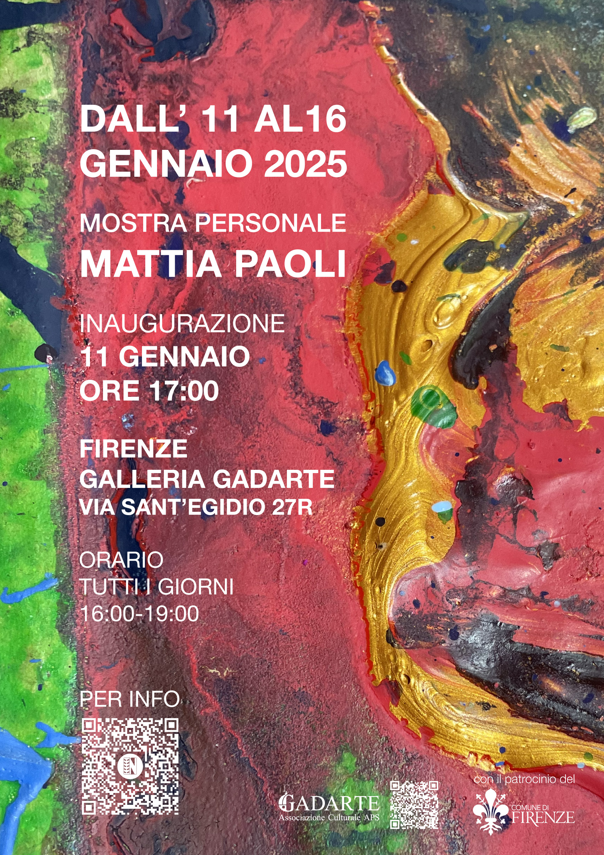 Mattia Paoli, nato a Firenze nel 1991, è un artista contemporaneo che spazia tra pittura, scultura, fotografia, design e arte digitale. Laureato con il massimo dei voti in Design presso l’Università di Firenze, esplora tecniche innovative combinando materiali non convenzionali come pneumatici d’auto e supporti sperimentali. Ha ricevuto numerosi riconoscimenti, tra cui il primo premio Cardo d’Argento nel 2025 e il primo premio under 25 alla IX Rassegna di Arte Contemporanea di Bagno a Ripoli. Ha esposto in gallerie prestigiose, tra cui Tornabuoni Art, ed è attivo a livello internazionale su piattaforme come Artfinder e Saatchi Art. È inoltre socio dell’Associazione “Amici di Gadarte”. La sua arte riflette una continua ricerca tra sperimentazione tecnica e profondità espressiva.