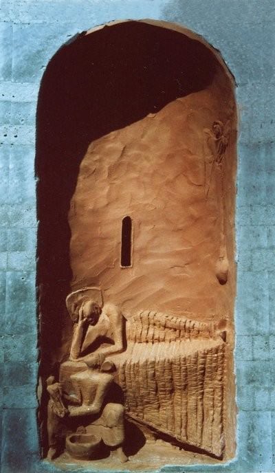 La storia del Cristo è descritta in nove nicchie in una sequenza scandita in gruppi di tre episodi, della nascita, della maturità e della morte. È visibile in mostra pure un gruppo di studi che sono la prima idea grafica dei soggetti trattati. Anche la sfida di tenere uno stesso contenitore, la stessa forma che accoglie, mi sembra ben riuscita. La nicchia, caratterizzata con piccoli, magistrali interventi, si apre di volta in volta ad ambientazioni completamente diverse. Può riempirsi sino all’inverosimile, come nell’Ultima Cena, o diventare luogo di silenzio, di spazio vuoto come nel Compianto. Entro le nicchie si svolge la storia dell’Uomo ma anche della Madre: elemento vitale, memoria del Figlio, affermazione del ruolo materno nel momento conclusivo.