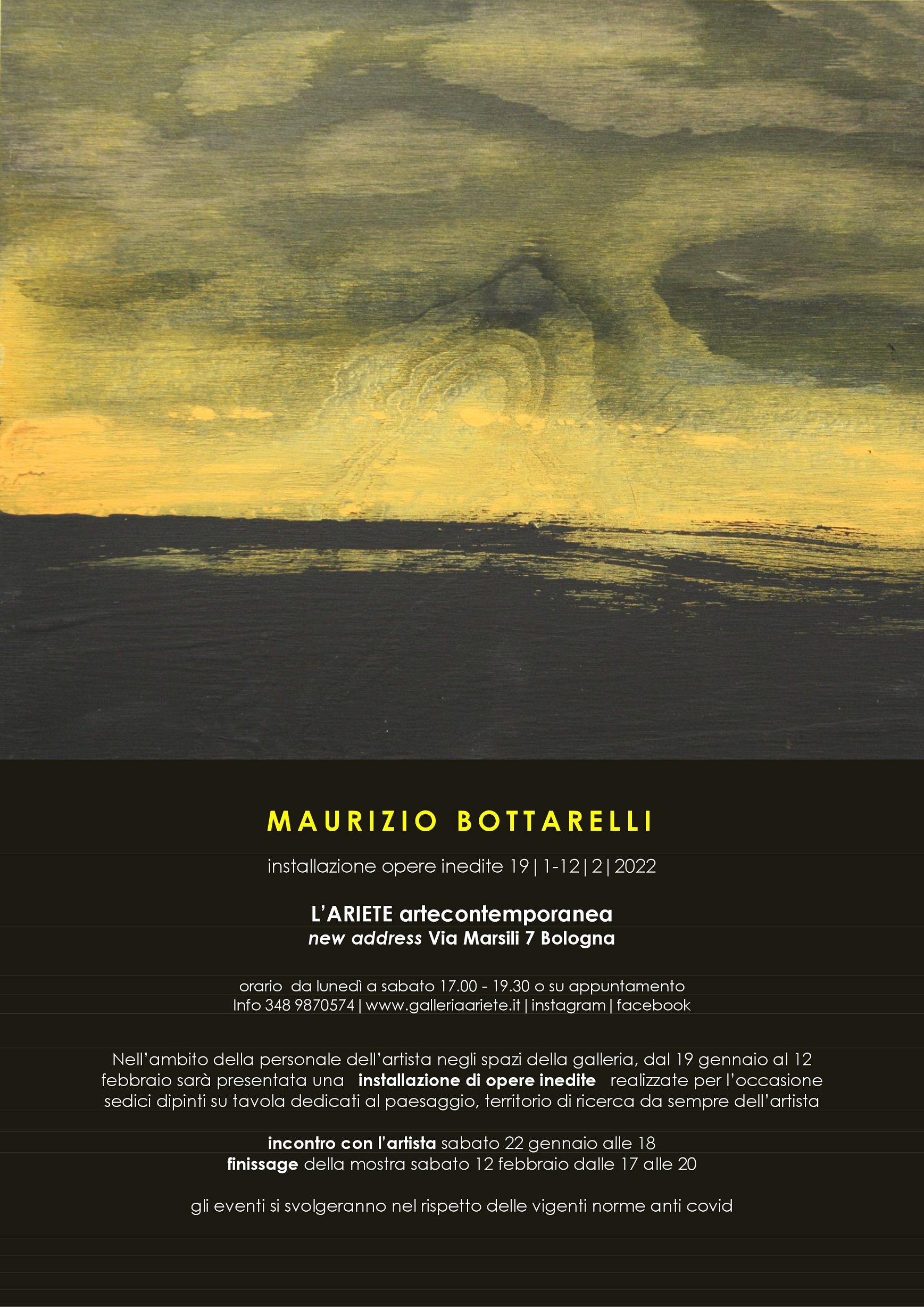 Dal 22 gennaio al 12 febbraio 2022 sarà presentata una installazione di opere inedite realizzate per l’occasione, un ciclo di dipinti su tavola dedicati al paesaggio, territorio di ricerca da sempre di Maurizio Bottarelli. In programma un incontro con l’artista sabato 22 gennaio alle 18 e il finissage della mostra sabato 12 febbraio dalle 17 alle 20. Gli eventi si svolgeranno nel rispetto delle vigenti norme anti covid.