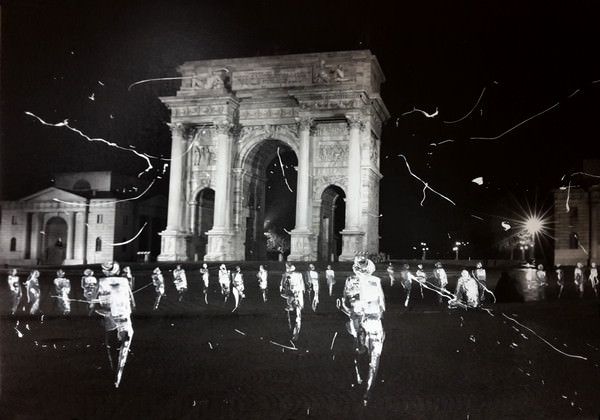 Nelle città fotografate da Maurizio Gabbana la scelta dell'ambientazione notturna è funzionale alla ricerca di intimità con lo scenario urbano, al desiderio di un'immersione al suo interno e finanche di una sua appropriazione, favorita dalla perdita dei contorni delle cose, dalla rarefazione di oggetti e persone, da una sorta di desertificazione dei sensi che accade a volte (queste volte) col calare del buio. I deserti ovviamente non sono tutti uguali, non lo sono neppure i notturni e tantomeno le città. Il deserto evocato dalle fotografie di Maurizio è un vuoto appagante, una scatola foderata di architetture monumentali e cariche di storia, il cui ruolo consiste però nell'arredare una sontuosa vacuità. Una luce precisa ma allo stesso tempo straniante si ritaglia il compito di delineare le vie di fuga dall'immagine, di incanalare lo sguardo verso un'oscurità cangiante. Le uniche figure che possono avere luogo in questa situazione sono non a caso dei fantasmi: gli spettri dipinti da Roberto Bosco, quanto più saturano le piazze e le architetture milanesi fotografate da Gabbana, tanto più le alleggeriscono, le smaterializzano, le svuotano, in una prospettiva ascendente.