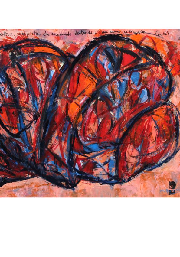 Un nomadismo culturale che assomma gusto dell’astrazione, capacità espressionistica del colore e controllata gestualità, costitusce la cifra stilistica del Pittore. Dai recenti lavori traspaiono i panorami della propria interiorità: sentimento del fluire del tempo, estasi musicali, memorie letterarie e citazioni poetiche, malinconie esistenziali e iconografie desunte dal suo vissuto, come i cuori selvaggi che popolano molte opere. L’autonomia intrinseca della materia pittorica tende all’indipendenza formale roteando su se stessa, creando vortici, stratificazioni, ritorni. Cerchi ed ellissi, figure archetipiche ripetute quasi ossessivamente, dinamiche rotatorie e fitti reticoli lineari conservano nella loro natura primaria un significato arcaico e simbolico. I ritmi sferoidali rimandano spesso ad una materia organica, come i grandi cervelli di suggestione baconiana, oppure sono simili a divagazioni oniriche che evocano insetti giganteschi, kafkiane presenze psichiche, frutto di mutazioni genetiche. La seduzione esercitata dal mondo vegetale sulla creatività di Gracceva è evidente nelle trasformazioni morfologiche dei suoi dipinti; le forme, dispiegandosi alla stregua di ramificazioni arboree, esplodono in un’intricata circolazione gestuale da cui trapela un’inquietudine di fondo, manifesta nei turbolenti contorni lineari e in una tavolozza audace, incentrata sui toni dei viola, dei blu, dei rossi. Nell’estetica dell’autore di “Cuori selvaggi” il valore delle forme concentriche e del dinamismo di macchie colorate assume una prioritaria funzione espressiva; l’interazione di segno, colore e spazialità accentua la sensazione di un’arte dilatata, in grado di generare nel fruitore un forte potere di captazione.