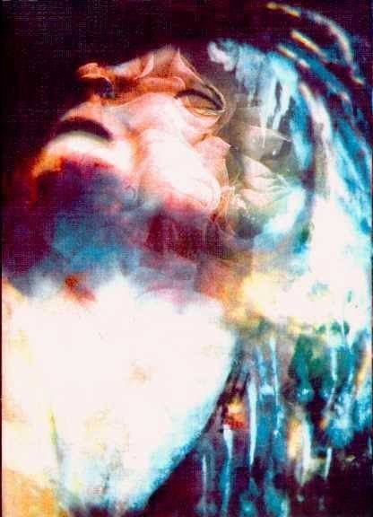 Dietro una fitta rete colorata è avvolto quasi come crisalide il volto di una donna, di cui si intravede solo qualche parte. E’ dall’intrico intessuto fra l’involucro e l’immagine nasce la suggestione di assistere ad una metamorfosi….