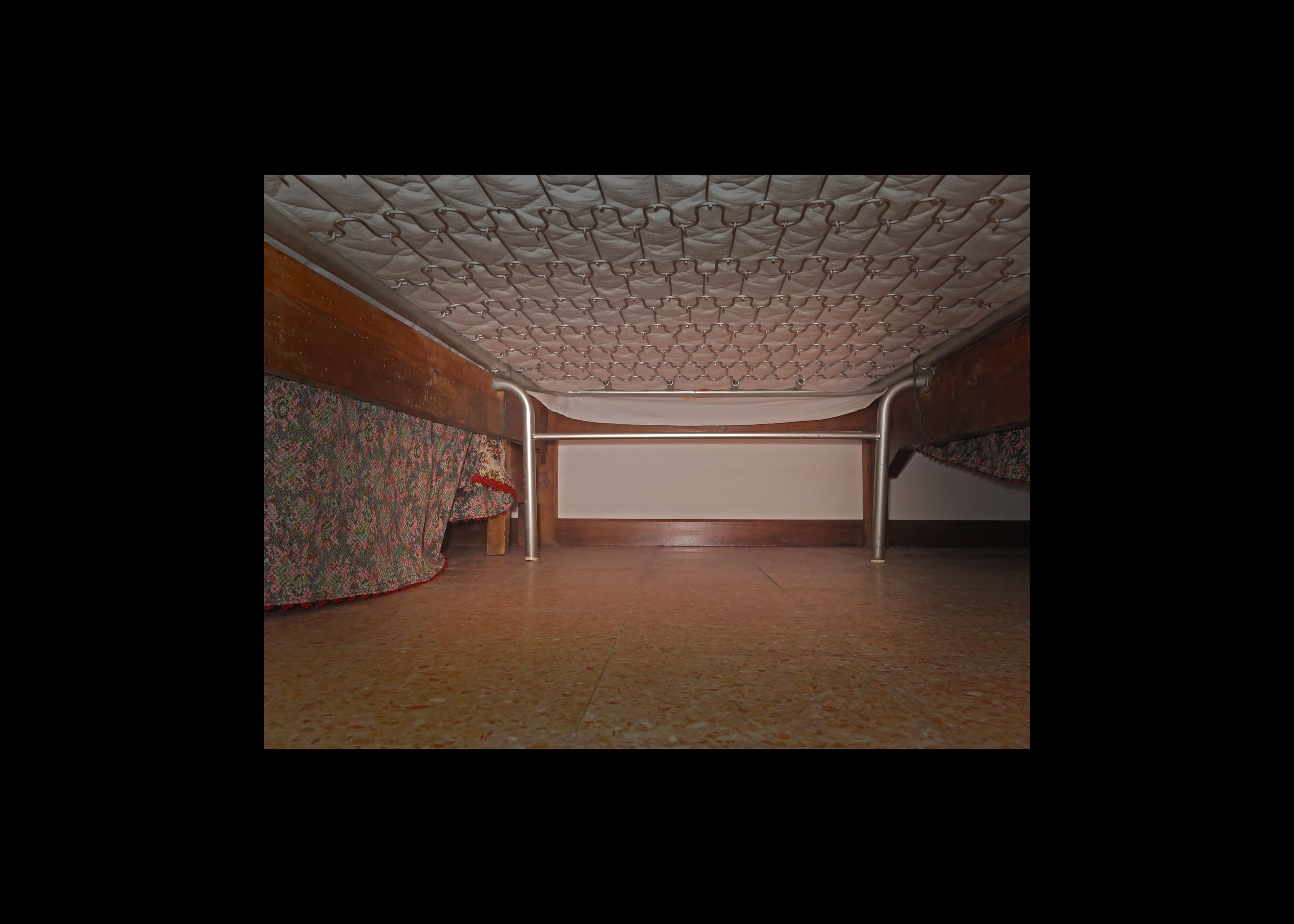 La ricerca di un punto di vista insolito di osservazione della realtà: è questa una delle linee guida che svelano alcuni degli enigmi proposti da Mercuri all’interno dei lavori in mostra. Mercuri cerca di rendere visibile il non visto, il già visto o il parzialmente dimenticato, ricercando continue e sottili forme di “innesco” con l’inconscio dell’osservatore. Il tema dell’autoritratto, presente in opere come Untitled, Aura (still from video), Omino di lampadine sul tavolo, introduce a quello della visione divergente sulla realtà fenomenica, che trova riscontro anche nella serie di stampe fotografiche intitolate Tema, che ha per soggetto il paesaggio nascosto situato sotto i letti e le automobili. Qui Mercuri conferma di saper giocare con maestria con i meccanismi legati all’inconscio, facendo precipitare l’osservatore nella dimensione temporale dell’infanzia. In questi lavori è centrale l’idea di traslazione, ribaltamento, gioco dei ruoli: il bambino osserva frammenti del mondo che coincidono solo parzialmente con quelli a disposizione dello sguardo dell’adulto. Esistono porzioni di spazio che manifestano la propria presenza, pur sfuggendo all’attenzione consapevole: Mercuri cerca di ridestare queste zone rimosse, cogliendone le architetture solitarie, mantenendone intatto il loro torpore.