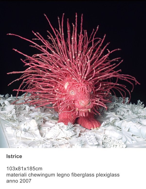 L’ingresso alla mostra si presenta sbarrato da due porte chiuse. Curiosando dallo spioncino di una delle due scopriamo un gigantesco orso di chewing gum