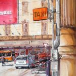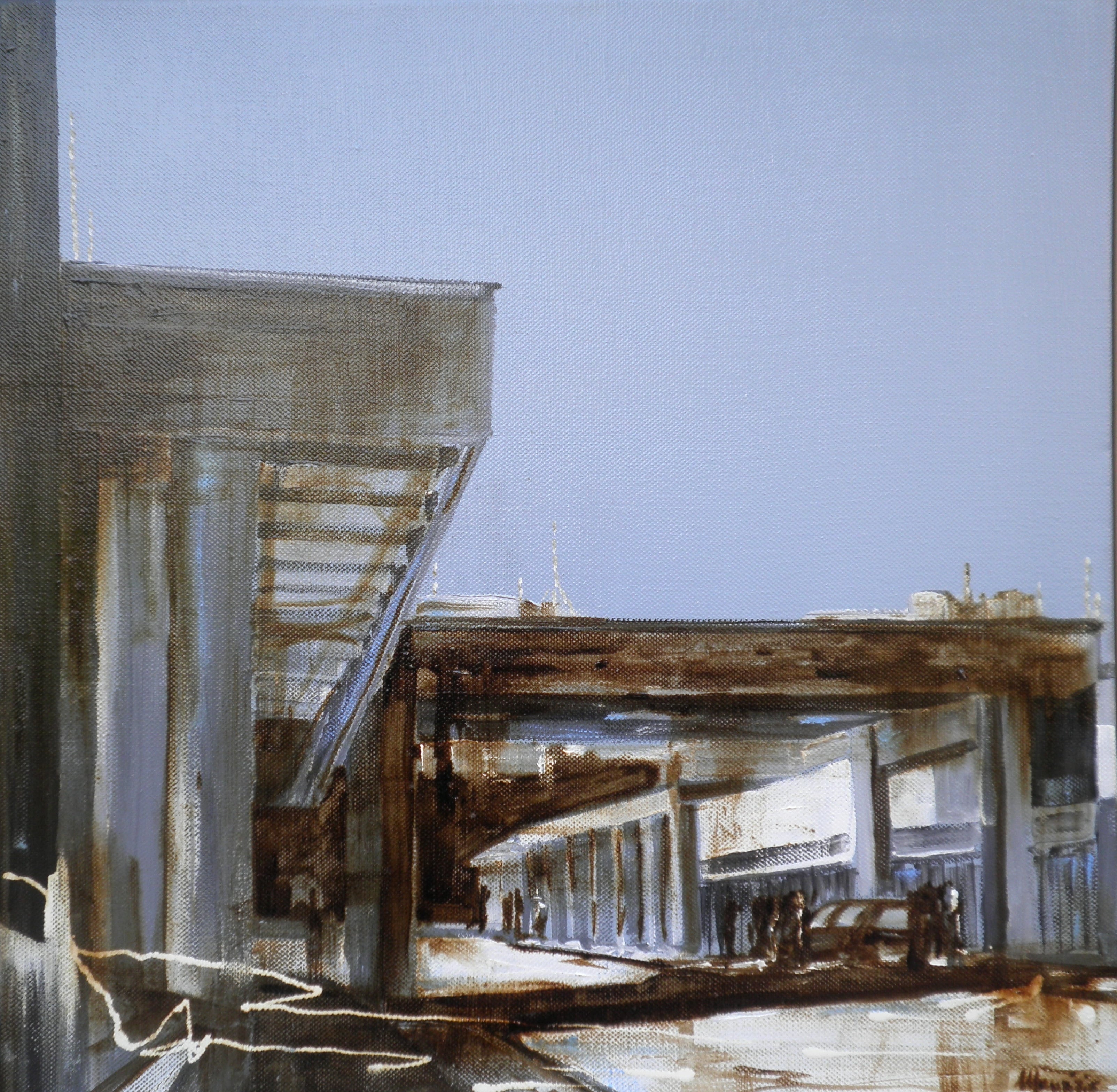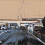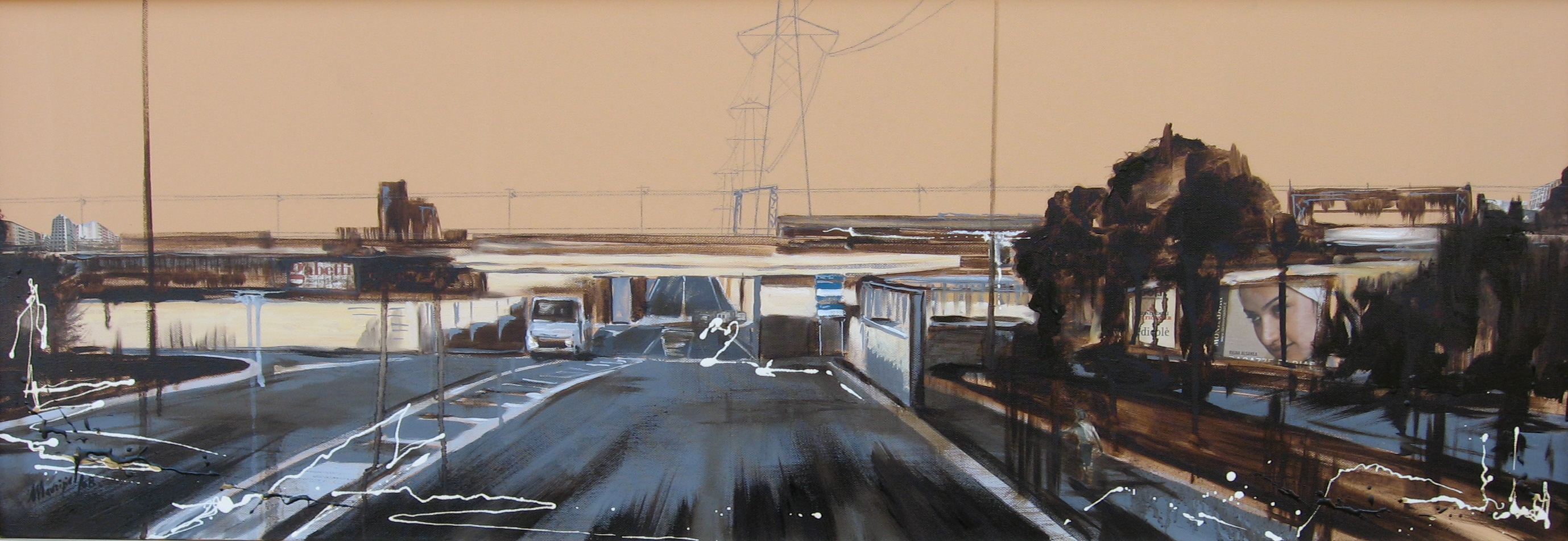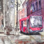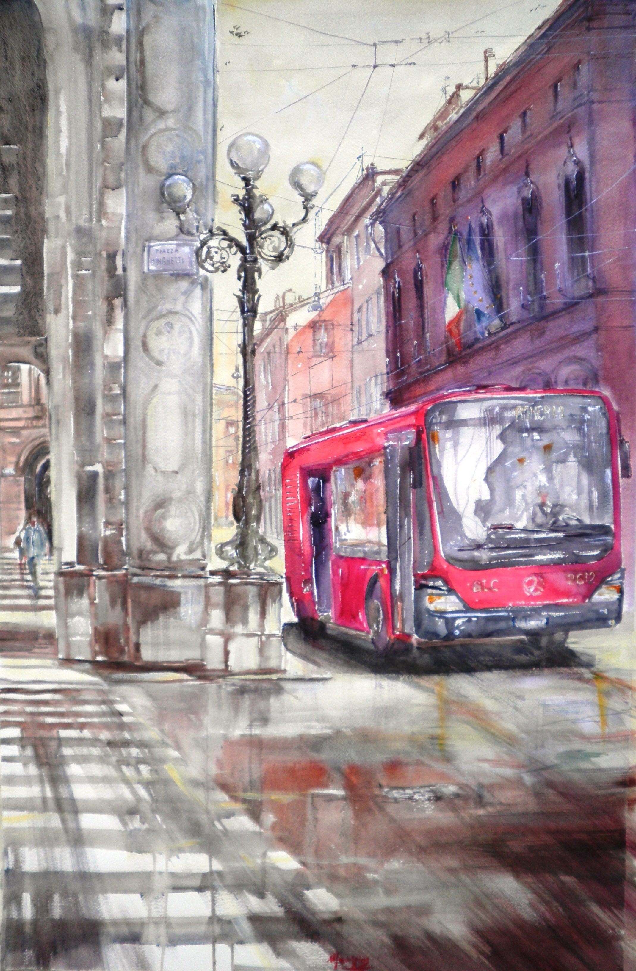 La mostra, dedicata a Bologna, presenta lavori recenti (oli e tecniche miste su tela, su carta applicata e su cartone) del noto pittore, bolognese d’adozione, Maurizio Tangerini. Il tema delle città è molto caro all’autore, ma fra tutte, quella che lo coinvolge empaticamente è sicuramente Bologna. Anche se l’artista ne è un figlio adottivo in quanto proveniente da Cento, si può affermare che Bologna è la sua madre di elezione, alla quale continua a tributare la sua opera con appassionata dedizione. Le sue rappresentazioni colgono un angolo, un portico in momenti di vita, con persone reali che vivono la loro esistenza con gesti naturali, senza alcuna affettazione, ma in una quotidianità nella quale ognuno si può riconoscere. Basta un particolare, un lampione, un’insegna, un autobus per connotare immediatamente un luogo. Tangerini è un artista che ha grande padronanza delle tecniche pittoriche: acrilico, olio, catrame, acquerello. I suoi lavori ad acquerello sono immediati, icastici: colgono le scene trascinandoci dentro ad esse. Le scene urbane sono rappresentate nel loro divenire quotidiano con persone che calcano la scena come in un palcoscenico naturale. Le periferie sono colte nella loro esistenza contemporanea: lacerti di edifici abbandonati; visioni di asfalto marcate da una linea bianca continua che si perdono allo sguardo, senza persone e dove le macchine assenti riescono ad accendere visioni opposte perché ci si immagina di vederle sfrecciare in lunghe code. Tangerini non esprime giudizi moralistici sulla desolazione delle periferie, ma spande un abbraccio artistico consolatorio, perché non si può amputare Bologna dalle sue periferie. Ma proprio per questa presa di coscienza che si sostanzia nelle rappresentazioni della città e dei suoi sobborghi, ci giunge chiaro e forte un messaggio artistico intrinseco di amore filiale per Bologna, unito alla consapevolezza per l’alienante desolazione di pezzi di periferia.