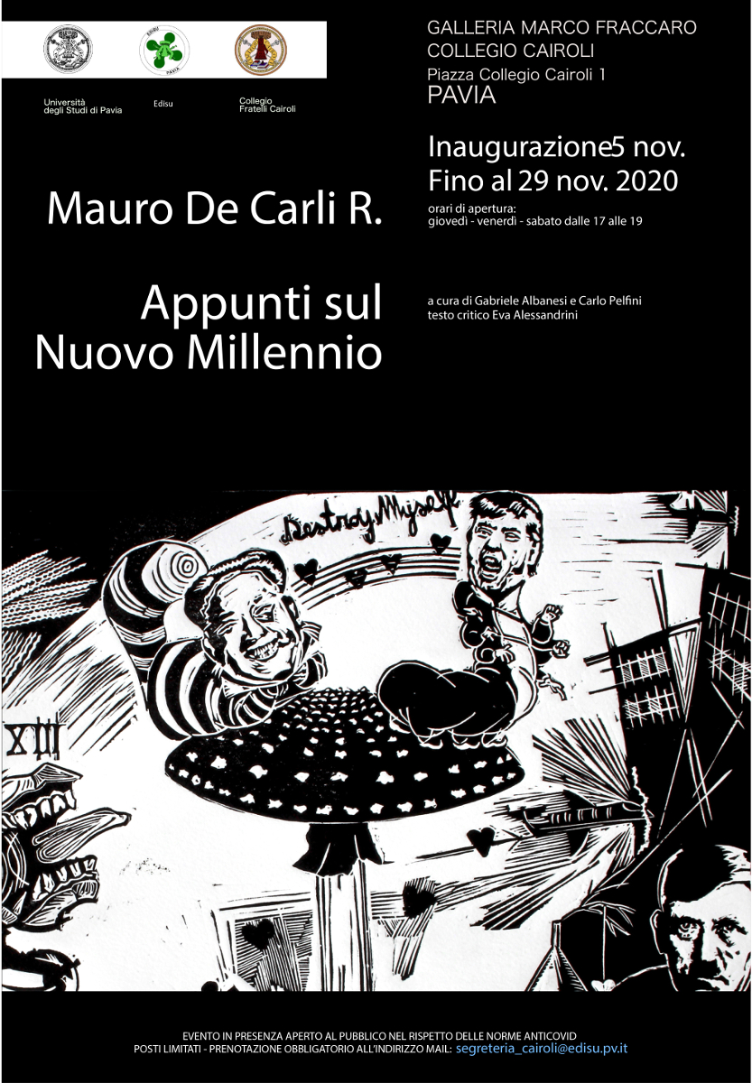 L’artista Mauro de Carli R. (1980) presenta un’originale lavoro di selezione di opere inerenti tematiche di natura sociale, politica, storica e più strettamente di cronaca, che hanno attraversato i primi due decenni del Nuovo Millennio. A partire dagli avvenimenti epocali in apertura di questa nuova era, come l’attentato alle Torri Gemelle e i fatti del G8 di Genova nel 2001, fino ad arrivare agli odierni scenari dominati dalla drammatica presenza del Virus Covid19, l’artista ci conduce a riflettere sul presente ed il recente passato tramite un gruppo di opere eterogenee per stili, tecniche e materiali che trovano ideale sistemazione nella storica Galleria Marco Fraccaro situata nel Collegio Cairoli in Via Cairoli 1 a Pavia. La mostra, che verrà inaugurata il 5 Novembre alle ore 17, sarà visitabile fino al 29 Novembre.