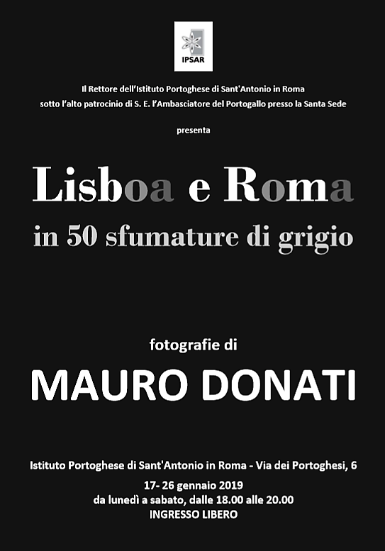 Sotto l’alto patrocinio di S.E. l’Ambasciatore del Portogallo presso la Santa Sede, Dr. ANTÓNIO DE ALMEIDA LIMA, il Rettore dell’Istituto Portoghese di Sant'Antonio in Roma, Mons. AGOSTINHO DA COSTA BORGES, è lieto di presentare la personale di fotografia di MAURO DONATI, che sarà inaugurata presso la galleria IPSAR giovedì 17 gennaio p.v., alle ore 18.00.