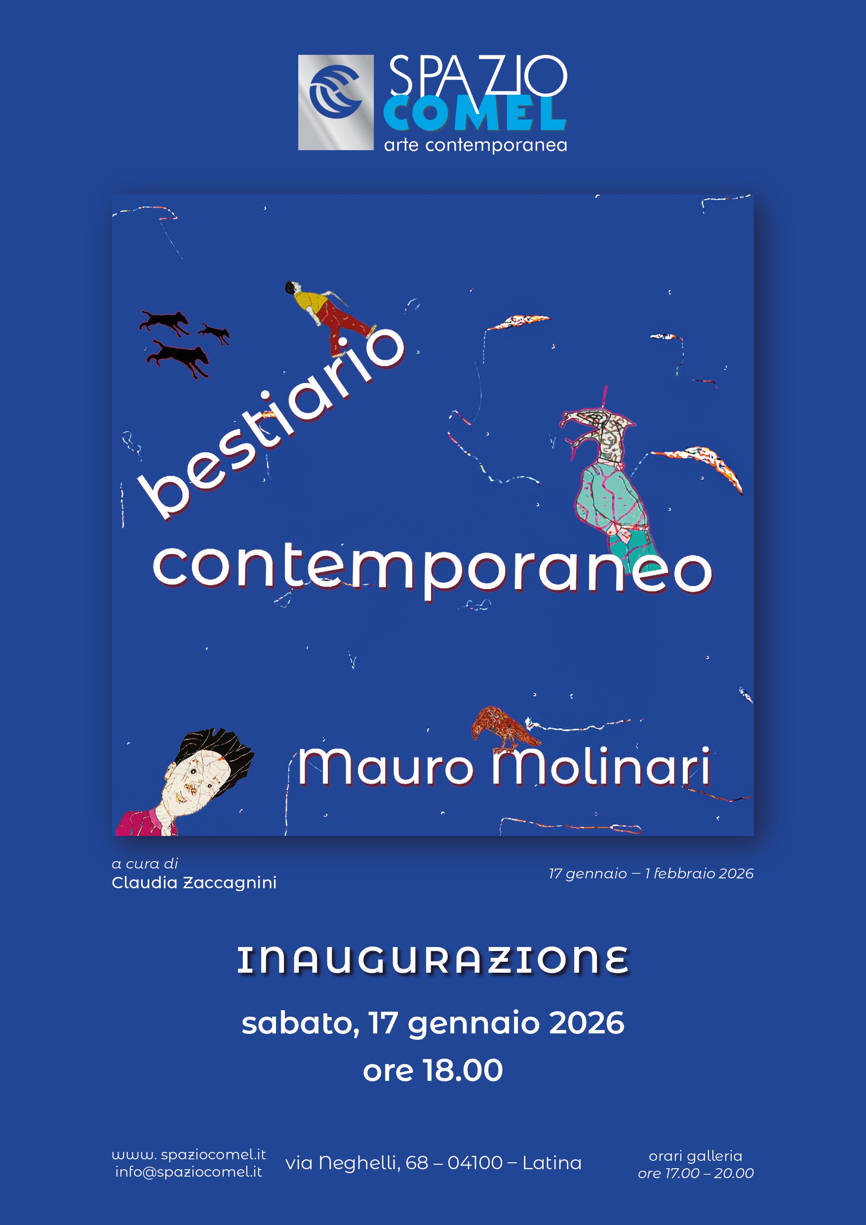 Presso la Galleria “Spazio Comel” di Latina, sabato 17 gennaio 2026, alle ore 18,00, si inaugura l’esposizione personale dell’artista romano Mauro Molinari, Bestiario contemporaneo, a cura di Claudia Zaccagnini. Opere di grande formato su tela e istallazioni.