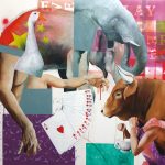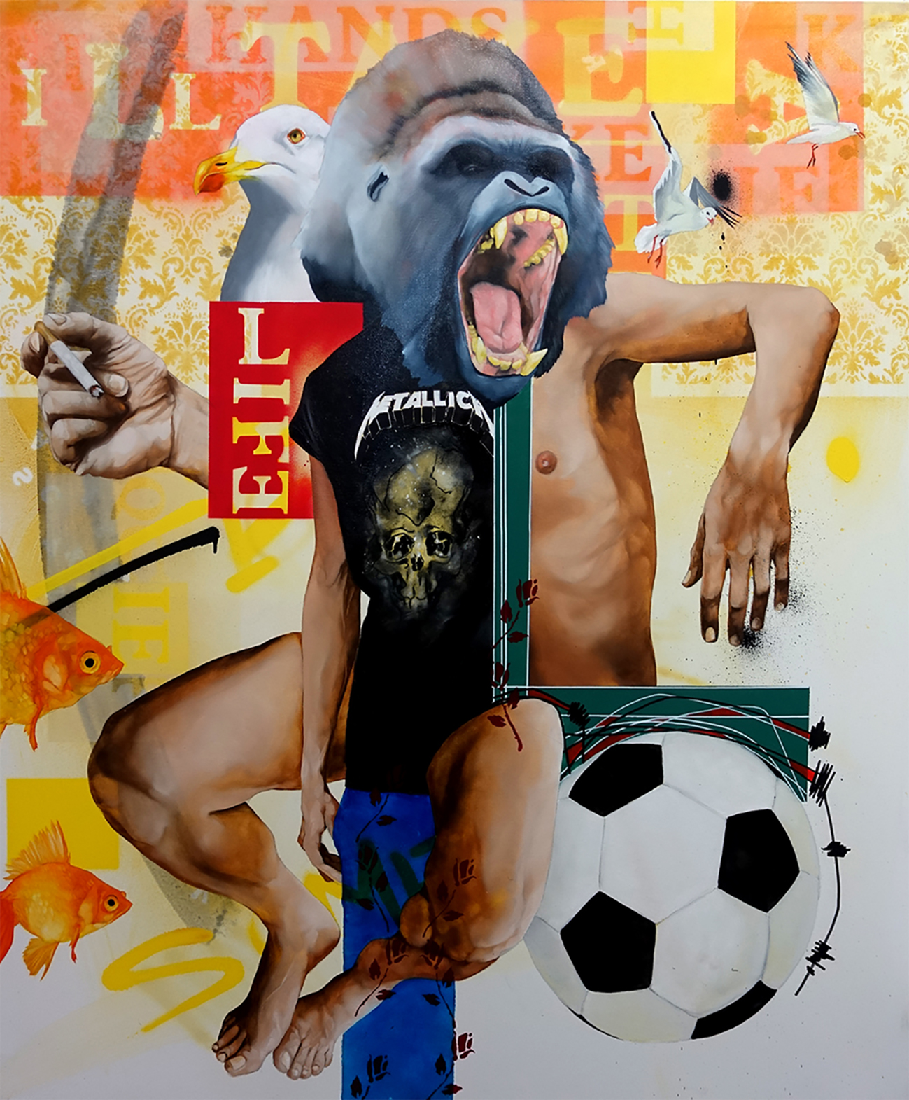 Corpi geneticamente irrisolti sfilano sulle tele e appaiono istintivamente familiari, vicini. Gli uomini con teste d’animali dipinti dall’artista sono il riflesso di uno specchio posizionato nella stanza della nostra più intima natura. L’io e l’ego s’interrogano sulla visione, sopra ogni tela c’è un alter ego da scegliere, possiamo decidere o attendere che ci riconosca ‘lui’. Comunque ci libereremo dalla maschere della buona apparenza perché, sia dentro che fuori rispetto al quadro, siamo ineluttabilmente e innegabilmente partecipi del processo di ri/e/voluzione della specie.