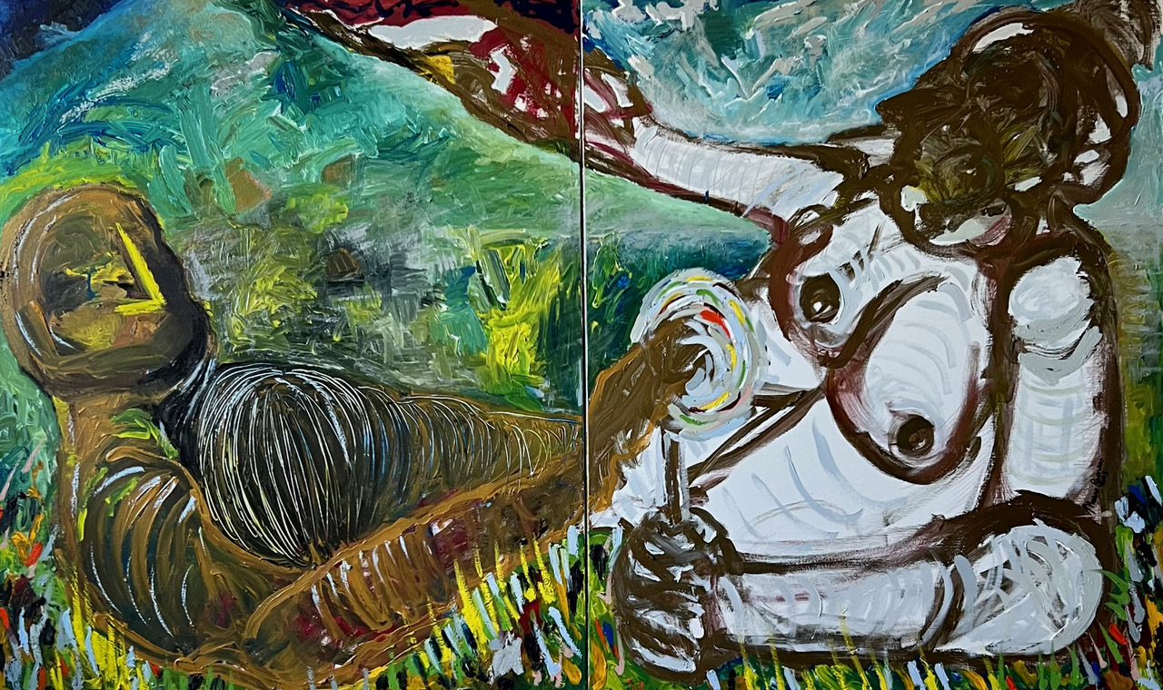 Corpi antropomorfi disperati, su un fondo elettrico, acido, indigeribile, fluttuanti ed al contempo pesanti, fatti di piombo, dinamici nella forma, ma paralizzati dalla mancanza, quasi urlanti, ma senza parole, patiscono di questo distacco e dialogano con ciò che di più profondo abbiamo: le viscere, perdendo pezzi ovunque, straziati da questo che a me pare essere un addio.