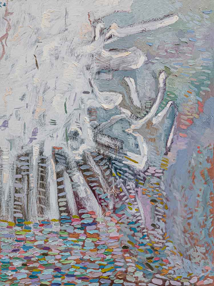 In mostra la serie pittorica “Quel che resta”, in cui l’artista cerca una maggiore relazione emozionale tra le proprie impressioni e la superficie pittorica. Come in una sorta di diario personale, le tele diventano “finestre” sull’attimo dopo qualcosa di significativo, che si fa traccia di un sentire energico e al tempo stesso evanescente: quel che resta dopo un litigio, dopo un ballo, dopo una fuga, dopo un naufragio, etc.
