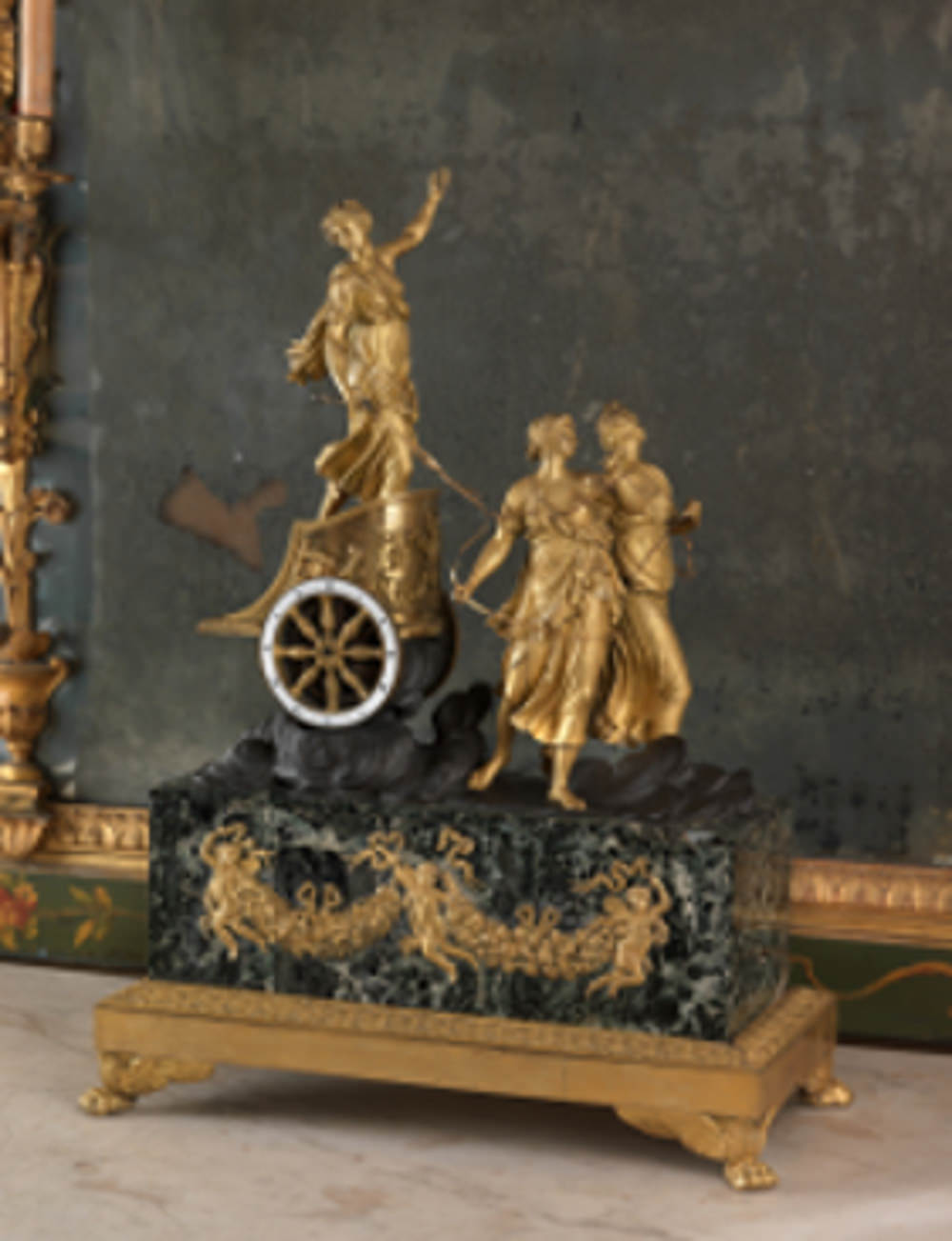 1. Orologio in marmo verde e bronzo dorato al mercurio, raffigurante il carro di Diana