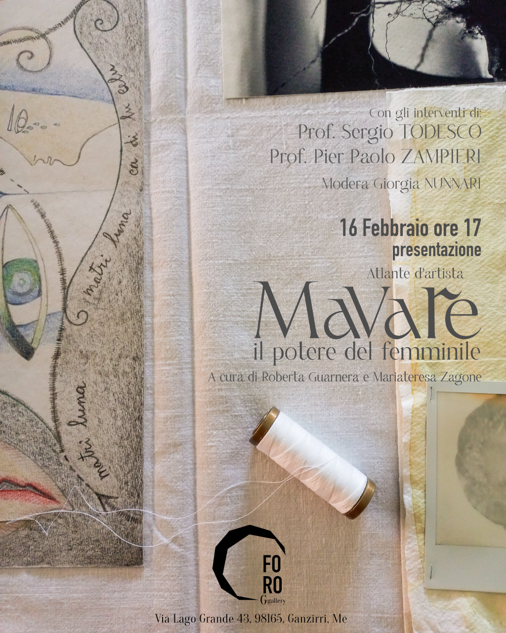 Un ritorno alla memoria dei rituali, alle origini, alle tradizioni popolari tramandate. Le opere, degli artist*, vengono cucite assieme, per raccontare del potere del femminile, delle mavare in un unico Atlante (d'artista). Domenica 16 Febbraio alle 17 verrà presentato "MAVARE - Atlante d'artista " creata da Roberta Guarnera, presso la FORO G gallery, con il testo critico di Mariateresa Zagone e gli interventi del Prof. Sergio Todesco e del Prof. Pierpaolo Zampieri, modera la giornalista Giorgia Nunnari