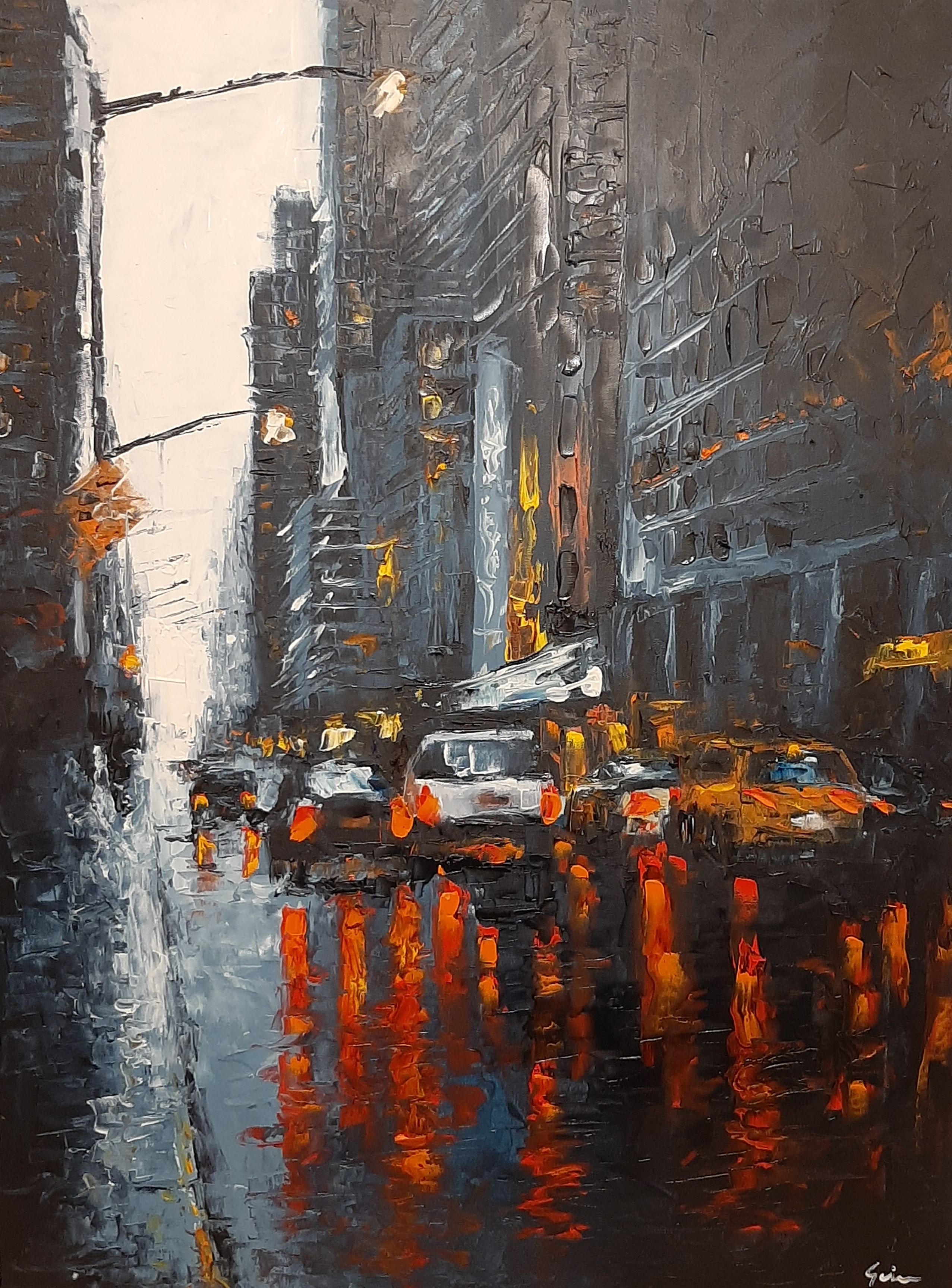 La sua pittura è colore puro, in una tecnica moderna, veloce e istintiva, che incanta per le emozioni suscitate. La luce è sempre la protagonista, a volte crepuscolare, dolce e diffusa, a volte più concentrata e quasi prepotente: è lei che ci guida nella lettura di queste vedute cittadine, ognuna diversa, ognuna con una sua propria anima, ognuna con un messaggio da comunicare. Tutto risulta straordinariamente poetico: nel mondo di Guarini l’ordinario entra a far parte dello straordinario.