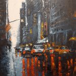 È così che queste tele dialogano con noi, presentandoci attimi di vita, tempo che scorre veloce fissato in un perfetto istante cristallizzato: scorci di strade, palazzi, panorami a noi noti e tuttavia rivisitati attraverso il filtro dell’interiorità e dei sentimenti; e ancora, volti rubati, mani, corpi che si stringono e si avvinghiamo, sconosciuti ma chissà perché così familiari.