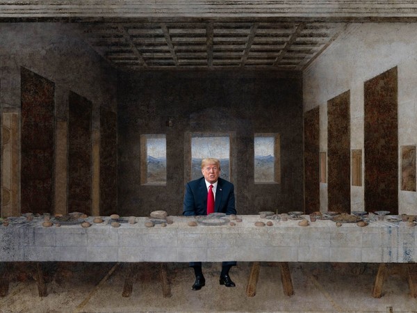L’incontro con Max Ferrigno dà vita a questa “Pyongyang Rhapsody”, dialogo spassoso e grottesco, gioco di specchi tra due autorevoli personaggi che l’impaginazione simmetrica della mostra, ieri nei Cantieri Culturali alla Zisa di Palermo, oggi nella galleria della Vecchia Dogana, visualizza in forma di botta e risposta. Un divertente crescendo di immagini iconiche che culmina nelle due gigantografie fronteggianti pescate da Papeschi dall’antologia visiva del Rinascimento: da un lato Trump, sostituito a Gesù nella celeberrima Ultima Cena di Leonardo e che sembra fare i conti con l’imprevista solitudine di una lunga tavola abbandonata dai commensali; dall’altro Kim al centro della conchiglia nella Nascita di Venere di Botticelli, circondato da cloni di Dennis Rodman, giocatore di basket del quale è fan sfegatato.