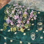 Nata nel 1924 in Georgia, ma cresciuta e formatasi a San Pietroburgo, Maya Kopitzeva vive un periodo particolarmente significativo del suo percorso artistico a Samarcanda in Uzbekistan, dove era stata trasferita l’Accademia durante la II guerra mondiale. Le insolite condizioni di vita, la singolarità e la bellezza dell’architettura uzbeka rimasero senza dubbio impresse nella memoria della giovane pittrice, così come il soggiorno presso la dacia accademica vicino a Volochek nella regione di Tver’ (1953), dove iniziò l’autentica fioritura del suo talento pittorico. Nelle sue opere, infatti, si rintracciano sia il senso dei colori e delle decorazioni dell’arte islamica assimilati a Samarcanda sia l’eco di una natura incontaminata e viva conosciuta durante la permanenza alla dacia dei pittori.