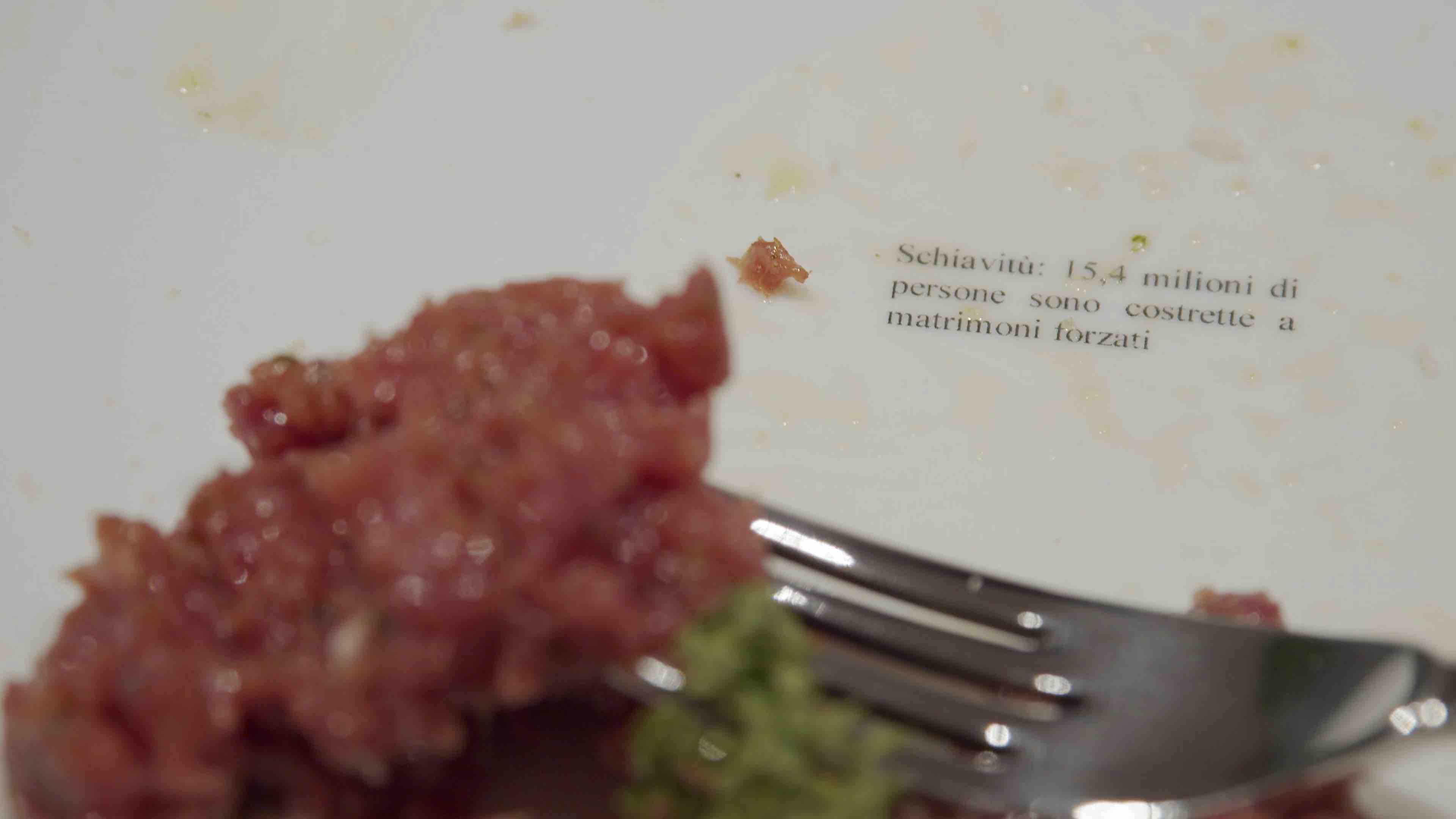 Non ho mai amato la carne cruda. Non so se gli altri commensali la pensino come me, ma non credo, dato che la tavolata elegante a cui siamo stati invitati sembra apprezzare la tartare di manzo che ci è stata servita. Tra una chiacchiera e l’altra, ingoiano boccone dopo boccone di quel piatto freddo. Io partecipo alla discussione distrattamente, giocherello con il cibo nel piatto. Sul fondo compare, una lettera dopo l’altra, la frase: «Le forze della polizia di Croazia e Slovenia bruciano sacchi a pelo, borsoni, requisiscono oggetti, effettuano pestaggi ai danni di migranti in transito». Potrebbe essere uno dei tanti titoli che ogni giorno scrollo sul mio smartphone. Ma ora Chiara me l’ha messo sul piatto, letteralmente, e lì, isolato tra quei bocconi di carne cruda, mi guarda e vuole essere letto, digerito. Mi rendo conto che era lui, e non la carne, la vera portata della cena. Un concentrato di violenza che chiude lo stomaco. Gli altri se ne sono accorti? La signora al mio fianco, che fino a qualche minuto prima sembrava mangiare con gusto, ora abbandona le posate a lato del piatto, e sospira contrita. Dice che il vino rosso che ha nel calice le sembra sangue. Ma c’è anche chi, dall’altra parte del tavolo, non rinuncia al pasto conviviale. L’ennesimo migrante morto nella traversata non intacca il suo appetito. Solo dopo aver terminato si sofferma sul testo, e scatta una foto con il suo telefono. Dal vociare di sottofondo emergono, una alla volta, le notizie lette ai vicini: «Marzo 2020-Genova: 4 uomini tra i 21 e i 35 anni offrono a una ragazza un passaggio a casa e la violentano in gruppo». «Schiavitù: 152 milioni di bambini nel mondo sono coinvolti nel lavoro minorile». «Una persona su 97 nel mondo è in fuga da conflitti, persecuzioni o violenze, pari a più dell’1 per cento della popolazione mondiale».