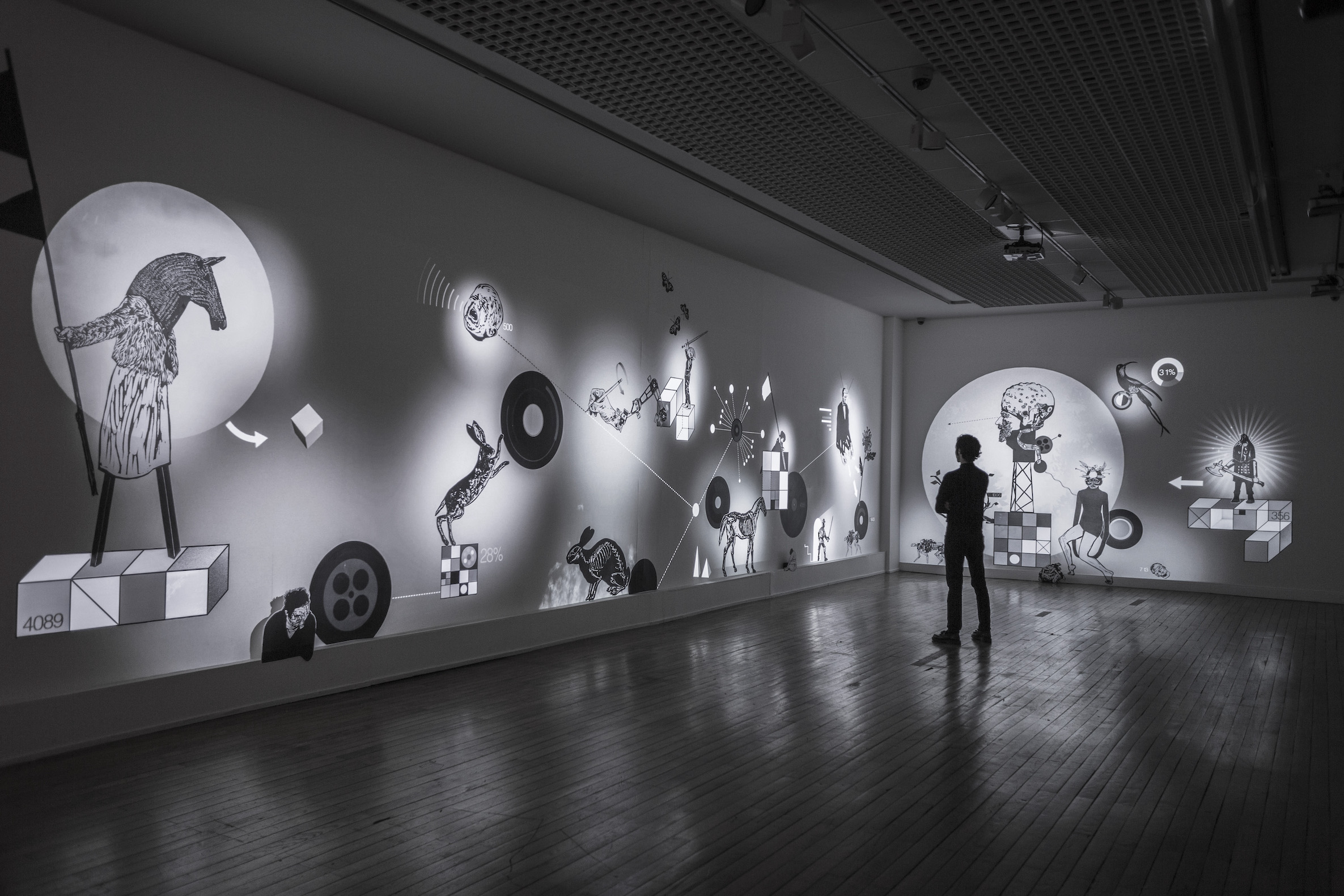 Tale immaginario simbolico prende vita tramite l’intervento di Jacquet: attraverso i codici del graphic design contemporaneo e del data design l’artista opera un processo di decontestualizzazione combinando, mediante una sorta di automatismo surrealista, elementi appartenenti ad ambiti diversi che si animano e si rincorrono lungo le pareti in una serie di reazioni a catena”.
