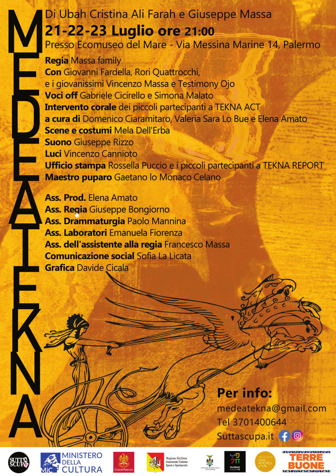 Medea Tekna, della compagnia Sutta Scupa diretta dal regista Giuseppe Massa, è progetto vincitore del bando periferie del Ministero della Cultura (MiC) con la collaborazione dell’Assessorato alla Cultura del Comune di Palermo. Lo spettacolo è la fase conclusiva di un percorso di ricerca e formazione avviata il 15 giugno nei quartieri di Brancaccio e Roccella: Tekna Report, laboratorio di comunicazione ed esplorazione urbana (a cura della giornalista Rossella Puccio), Tekna Set, laboratorio di scenografia (a cura di Mela Dell’Erba) e Tekna Act, laboratorio di recitazione (con Giuseppe Massa, Rori Quattrocchi, Domenico Ciaramitaro, Elena Amato e Valeria Sara Lo Bue). Si ringraziano l’assessorato Turismo Sport Spettacolo della Regione siciliana, il Comune di Palermo e i partner che hanno sostenuto l’iniziativa ospitando i laboratori: Ecomuseo Mare Memoria Viva; Aps Terrebuone Brancaccio; Casa Al Bayt del Centro Padre Nostro e la Parrocchia Maria SS. delle Grazie. I giovani partecipanti ai laboratori: Luigi Costantino, Pietro Costantino, David Demeter, Sofia Giglio, Sara Graham, Emmanuel Masopeh, Miriam Raina, Carmelo Rubino, Andrea Tabita, Julian Tabita, Mohammed Toure, Queen Igbinigie, Martina Ziami.